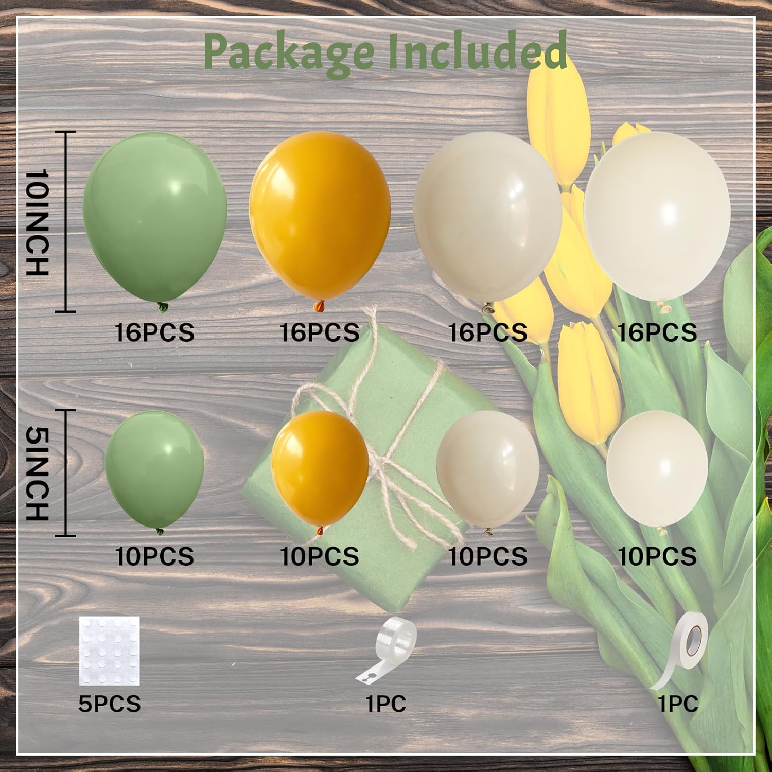 • What You Get - Sage Green Mustard Yellow Cream Sand White Balloon Garland Arch Kit, package including 64pcs 10 inches balloons(sage green*16, retro mustard lemon yellow*16, sand white*16, ivory white*16), 40pcs 5 inches balloons(sage green*10, retro lemon yellow*10, sand white*10, ivory white*10), 1 roll of 5 meters balloon strips, 1 roll of ribbon, 5pcs dot glues. Total 111 pcs, all in one package!