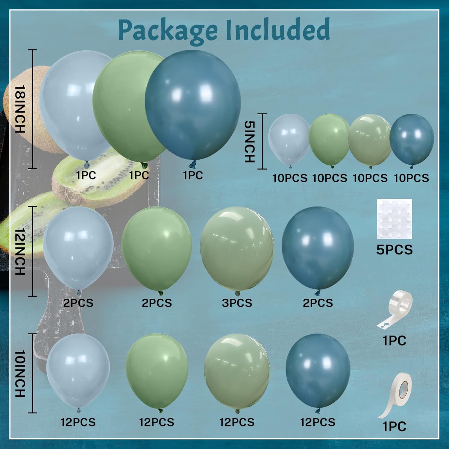 • What You Get - Dusty Blue Sage Green Balloon Garland Arch Kit, package including 3pcs 18 inches balloons(sage green*1, retro mist blue*1, navy blue*1), 9pcs 12 inches balloons(sage green*2, retro mist blue*2, dusty green*3, navy blue*2), 48pcs 10 inches balloons(sage green*12, retro mist blue*12, dusty green*12, navy blue*12), 40pcs 5 inches balloons(sage green*10, retro mist blue*10, dusty green*10, navy blue*10), 1 roll of 5-meter balloon strips, 1 roll of ribbon, 5pcs dot glues. Total 107pcs.