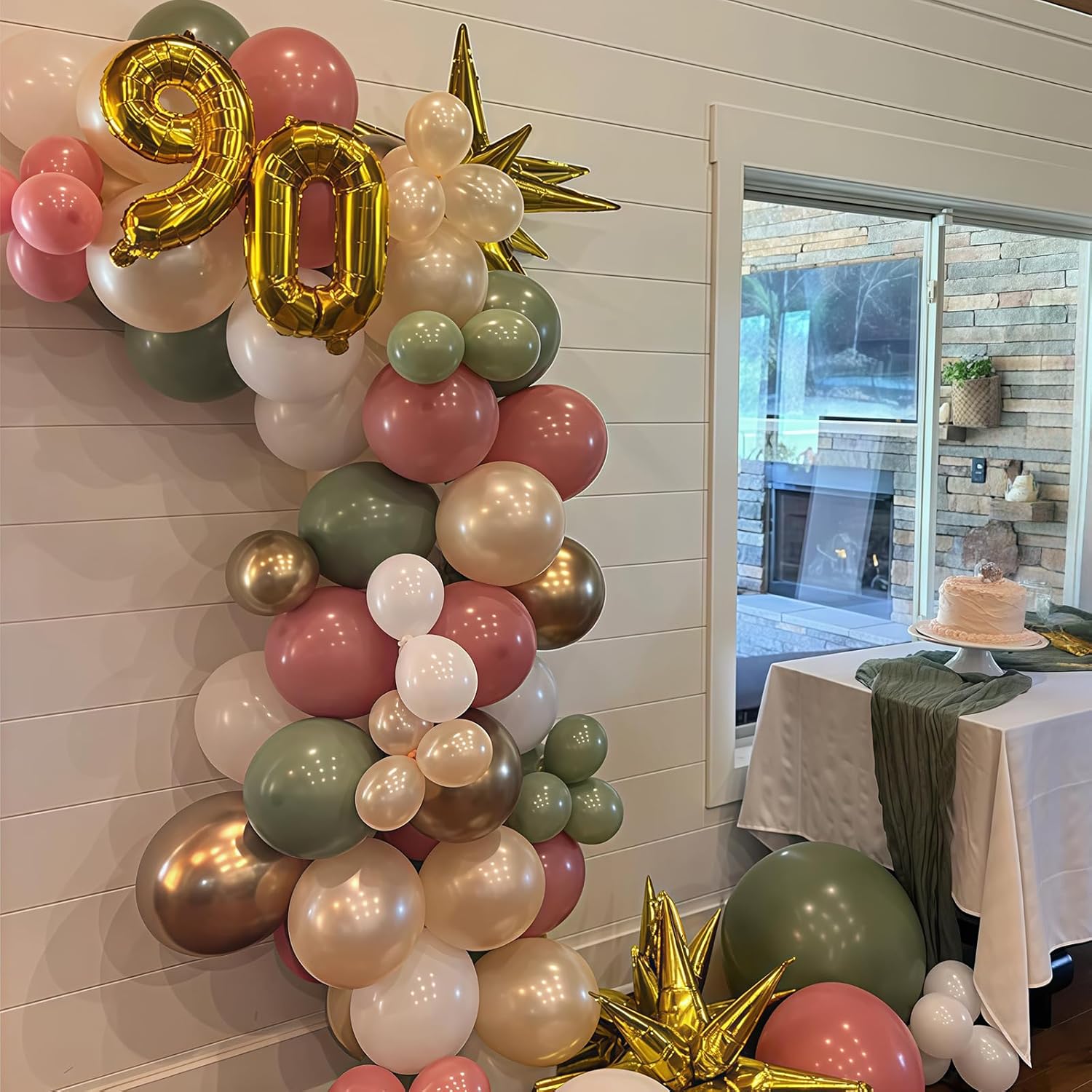 • What You Get - Sage Green Dusty Pink Gold Balloon Garland Arch Kit, package including 10pcs 12 inches balloons(dusty pink*2, sage green*2, pearl champagne gold*2, white*2, metallic light champagne gold*2), 80pcs 10-inch balloons(dusty pink*16, sage green*16, pearl champagne gold*16, white*16, metallic light champagne gold*16), 30pcs 5-inch balloons(dusty pink*6, sage green*6, pearl champagne gold*6, white*6, metallic champagne gold*6), 1pc 5 meters balloon strips, 1pc ribbon, 5pcs dot glues.