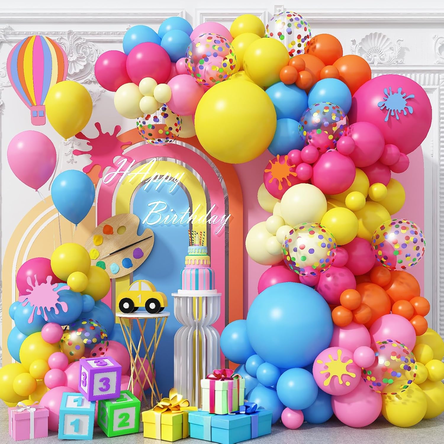 • What You Get - Rainbow Balloon Garland Arch Kit, package including 8pcs 12 inches colorful confetti balloons, 3pcs 18 inches balloons(yellow*10, light blue*1, rose red*1), 60pcs 10 inches balloons(yellow*10, pink*10, light blue*10, rose red*10, orange*10, macaron yellow*10), 48pcs 5 inches balloons(yellow*8, pink*8, light blue*8, rose red*8, orange*8, macaron yellow*8), 1 roll of 5 meters balloon strips, 1 roll of ribbon, 5pcs dot glues. Total 126 pcs, all in one package!