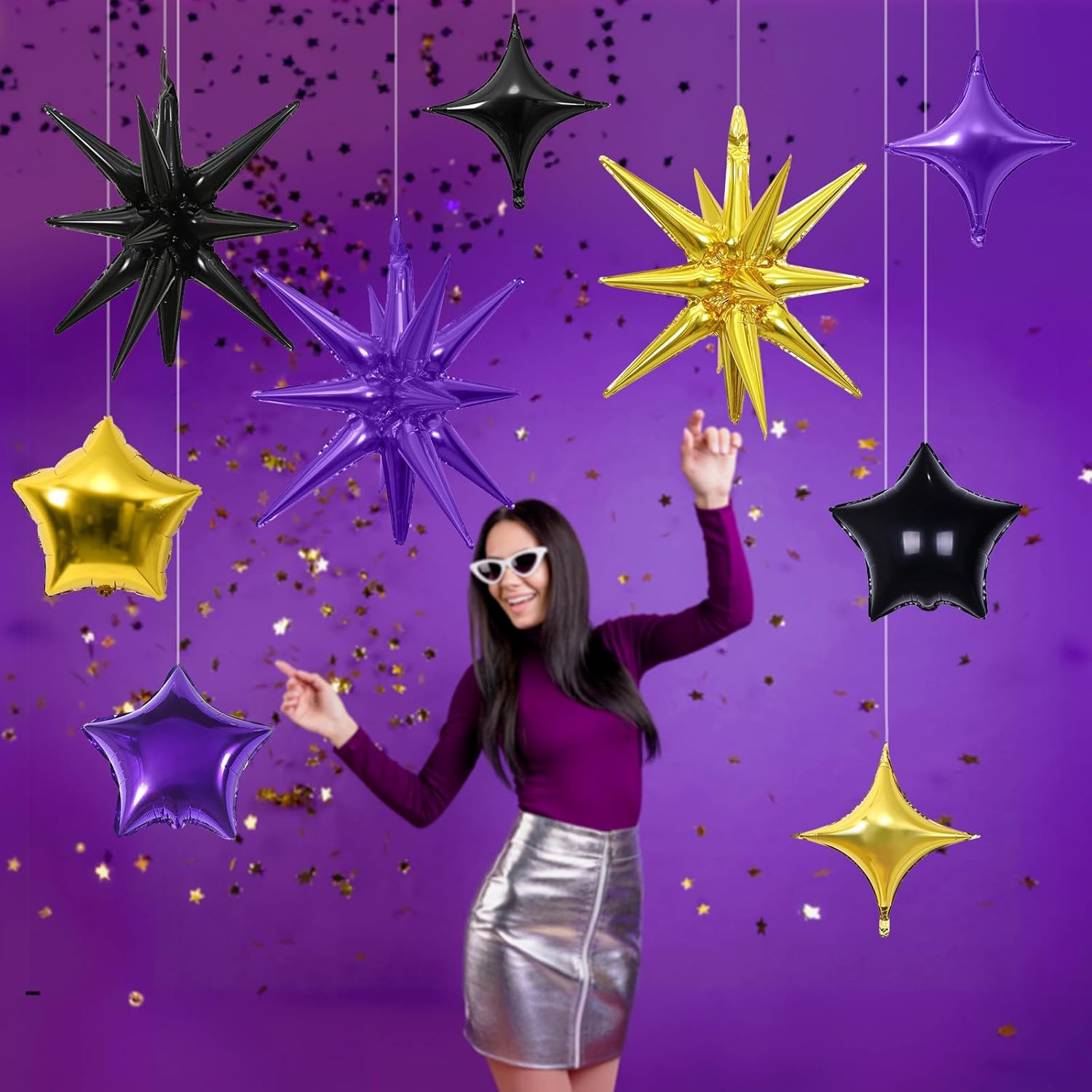 • Purple Gold Balloons Set: Package includes: purple, black, gold three-color aluminum foil star balloons (explosion stars Γ— 3, four-pointed stars Γ— 6, five-pointed stars Γ— 6) , a straw and ribbon