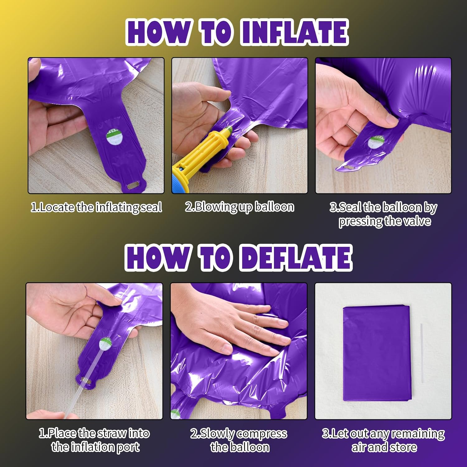 • Reusable Foil Balloons: The purple and gold star balloon set is completely reusable. Avoid excessive friction and sharp objects when using it. Use a straw to deflate and flatten it after event, and it will still be a shining decoration at the party next time