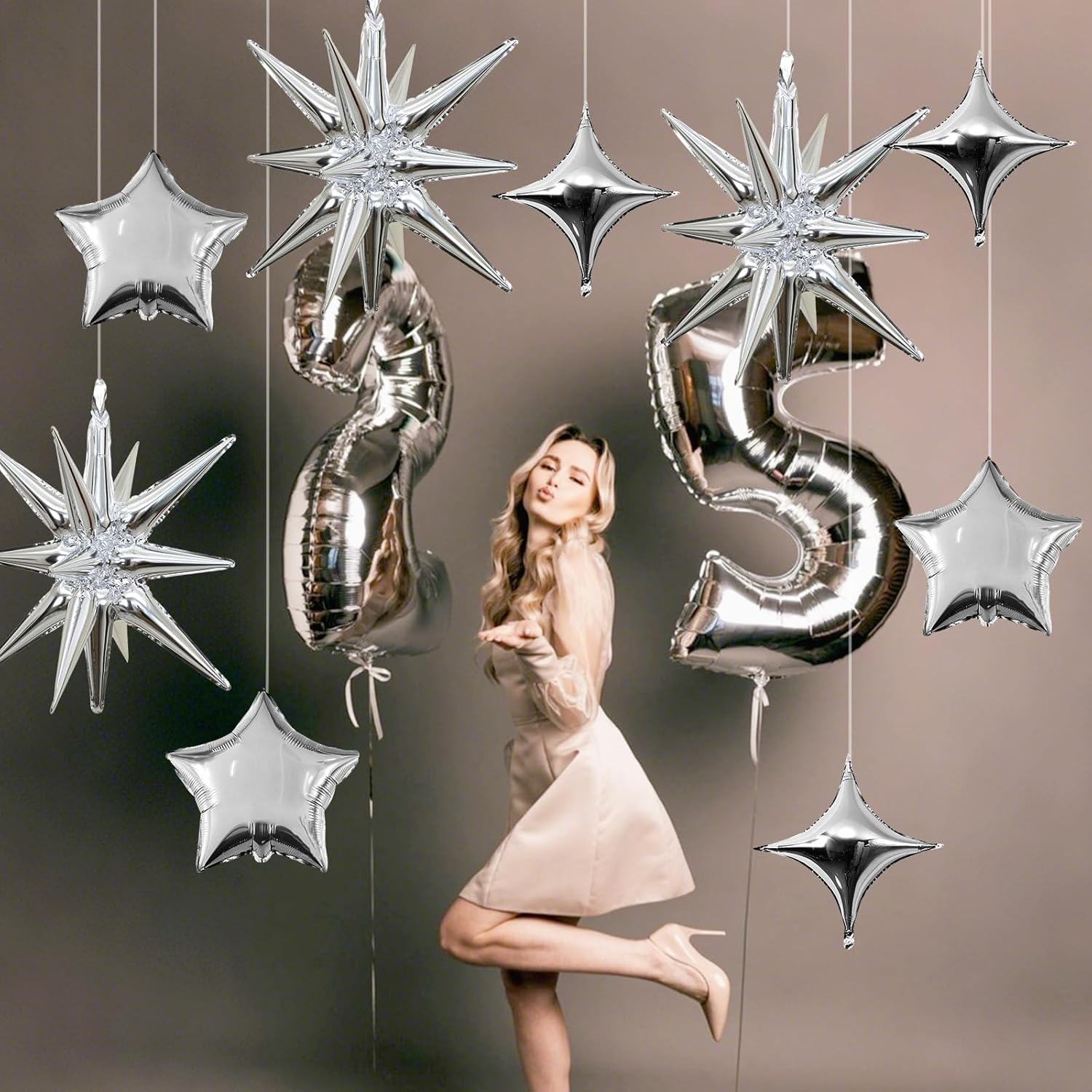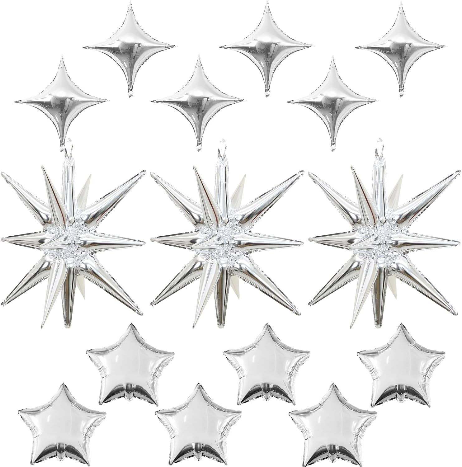 • Silver Star Balloons Set: Package includes: silver aluminum foil star balloons (explosion stars Γ— 3, four-pointed stars Γ— 6, five-pointed stars Γ— 6) , a straw and ribbon