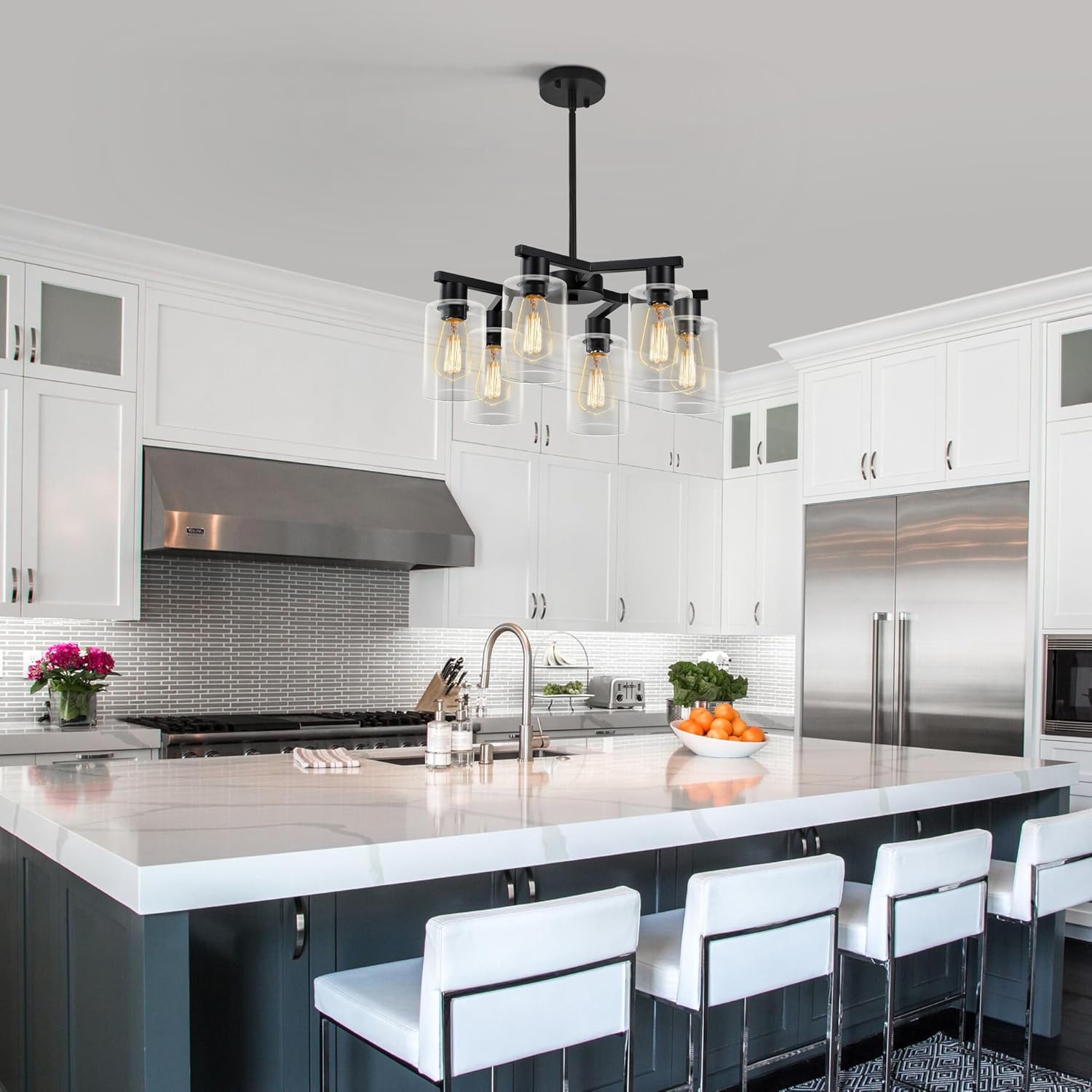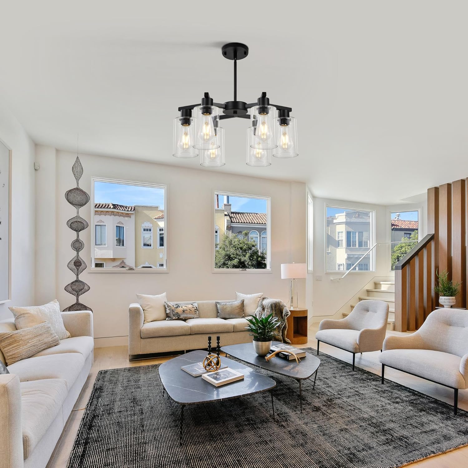 • 【Unique contemporary design】This black chandelier has three elegant “Y” shaped arms that reach out from the center in a distinctive interlocking shape, paired with six cylindrical glass shades to create a striking geometric silhouette. The modern glass chandelier body is crafted from high quality metal with a matte finish for a premium and classy texture. The transparent glass shades are like a light veil, gently wrapping the light and scattering it softly. The shades and the metal body reflect each other, perfectly blending the ruggedness of the industrial style with the sophistication of the glass, highlighting the unique style.