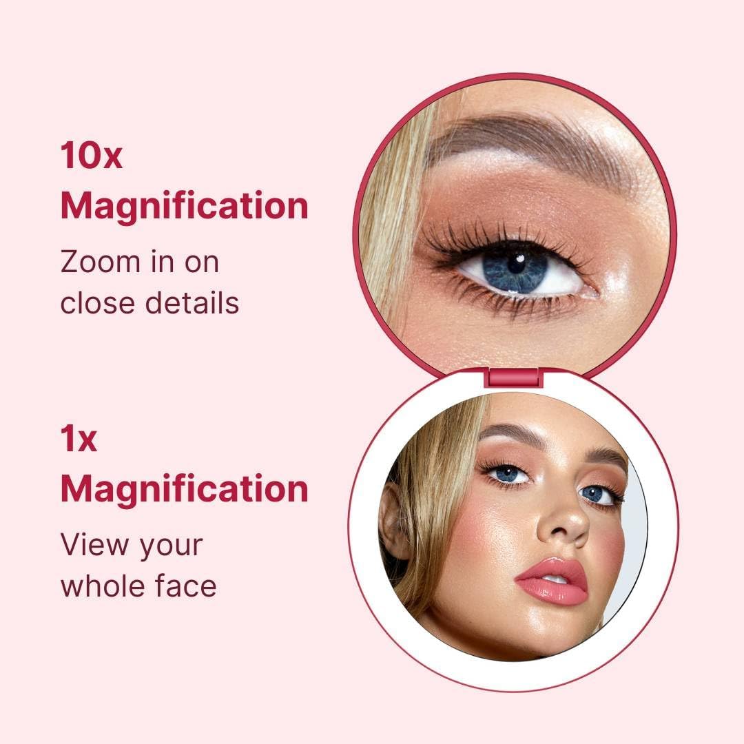 • Double-sided magnification (1x and 10x) so you can apply a full face of makeup, do a quick touch-up on the go, or focus on a detailed task like tweezing or inserting contact lenses