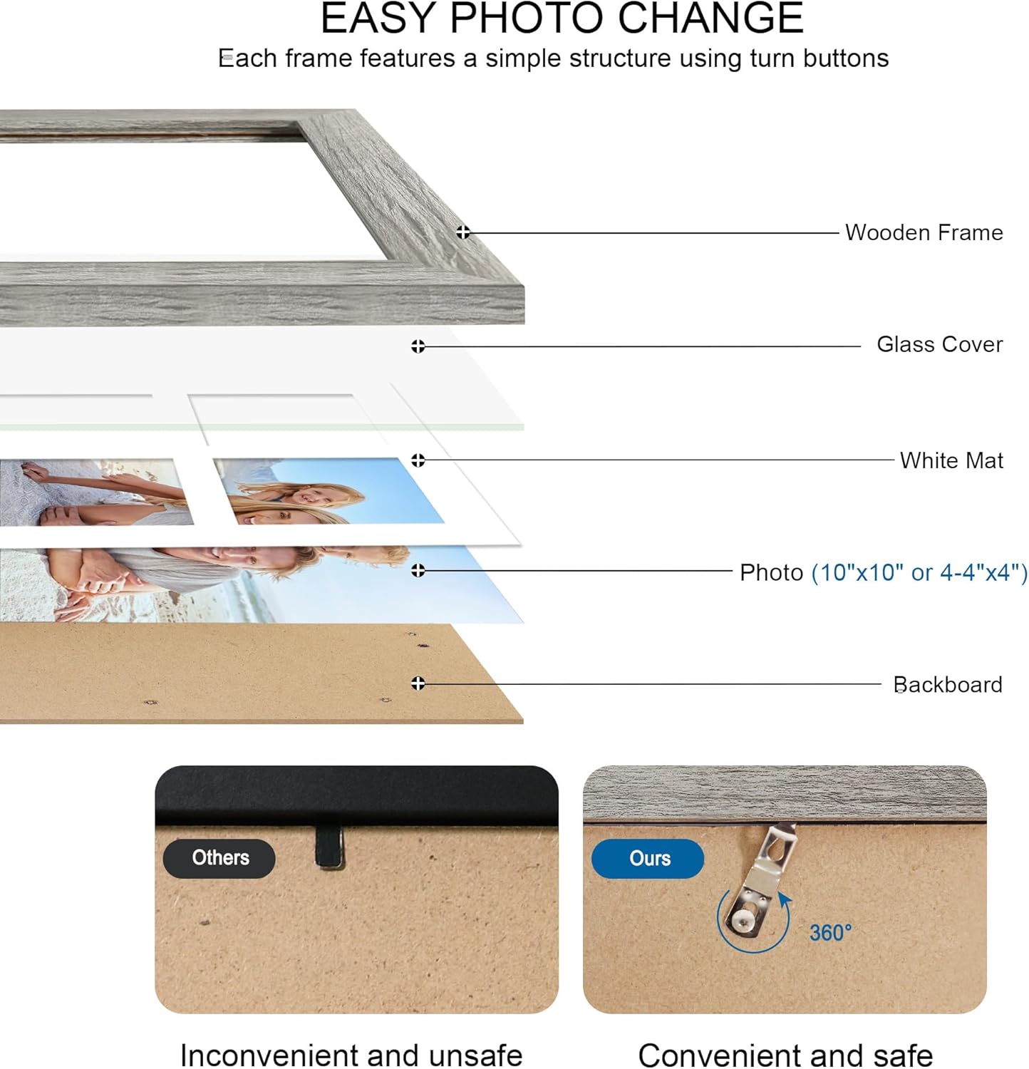 • Rustic Wood and Glass - The 10x10 collage picture frames made of durable MDF wood compared to other flimsy PS or plastics frames. we use tempered glass is an exceptional alternative to plexiglass, eliminating the inconveniences of bending, reflection, fragility, and susceptibility to scratches. Its edges are meticulously polished, ensuring your safety and shielding you from the harm caused by sharp glass edges