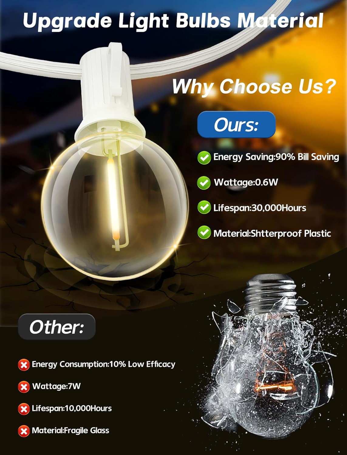 • Bright & Energy Efficient: 50FT G40 LED white string lights contain 50 plastic LED bulbs and 2 spare bulbs. 1.5-inch bulbs adopt E12/C7 sockets, 0.6 watt per bulb, white outdoor lights can help you save more electricity
