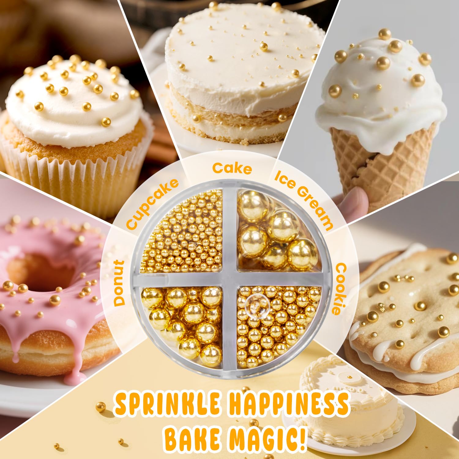 • The Gold Pearl Sprinkles can be used to decorate cupcakes, ice cream, cakes, cookies and chocolates. Gold Pearl Candies are an excellent choice for baking desserts. Gold pearl sprinkles can make your baking more elaborate. They are simple to use, just sprinkle them over your baking as they transform into works of art.