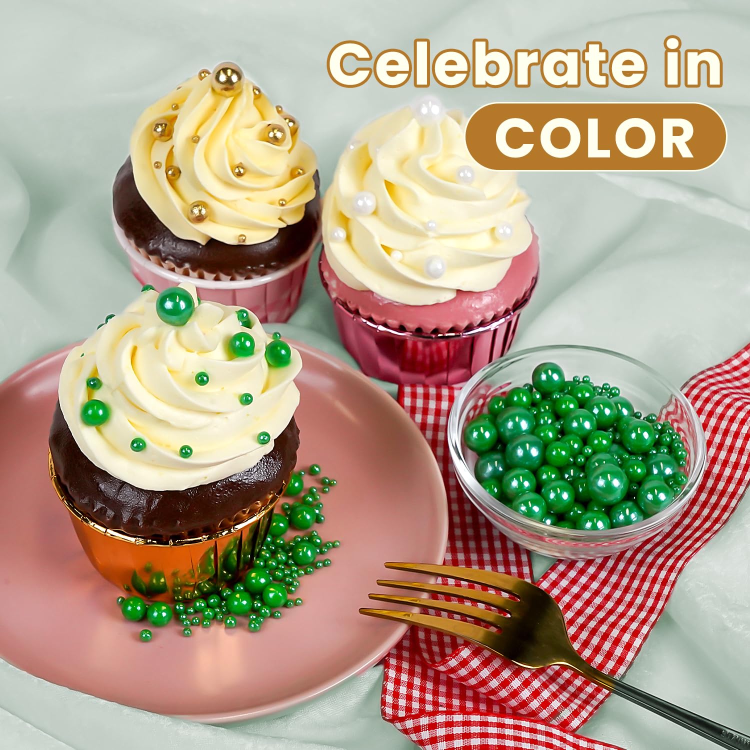 • Safe & Certified Pearls: Food-grade green pearls sugar sprinkles made with non-GMO ingredients, 0% preservatives. Kosher/Halal-certified in facilities with no allergens (soy/nut/dairy). Tamper-proof sealed for safety.