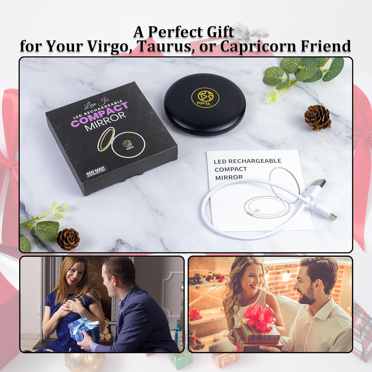 LanJo Lighted Compact Mirror with 1X/5X Magnification, Stepless Dimming & 3 Adjustable Light Settings, Rechargeable Makeup Mirror for Purse, Travel & Gifts – Earth Sign Zodiac Design – Black