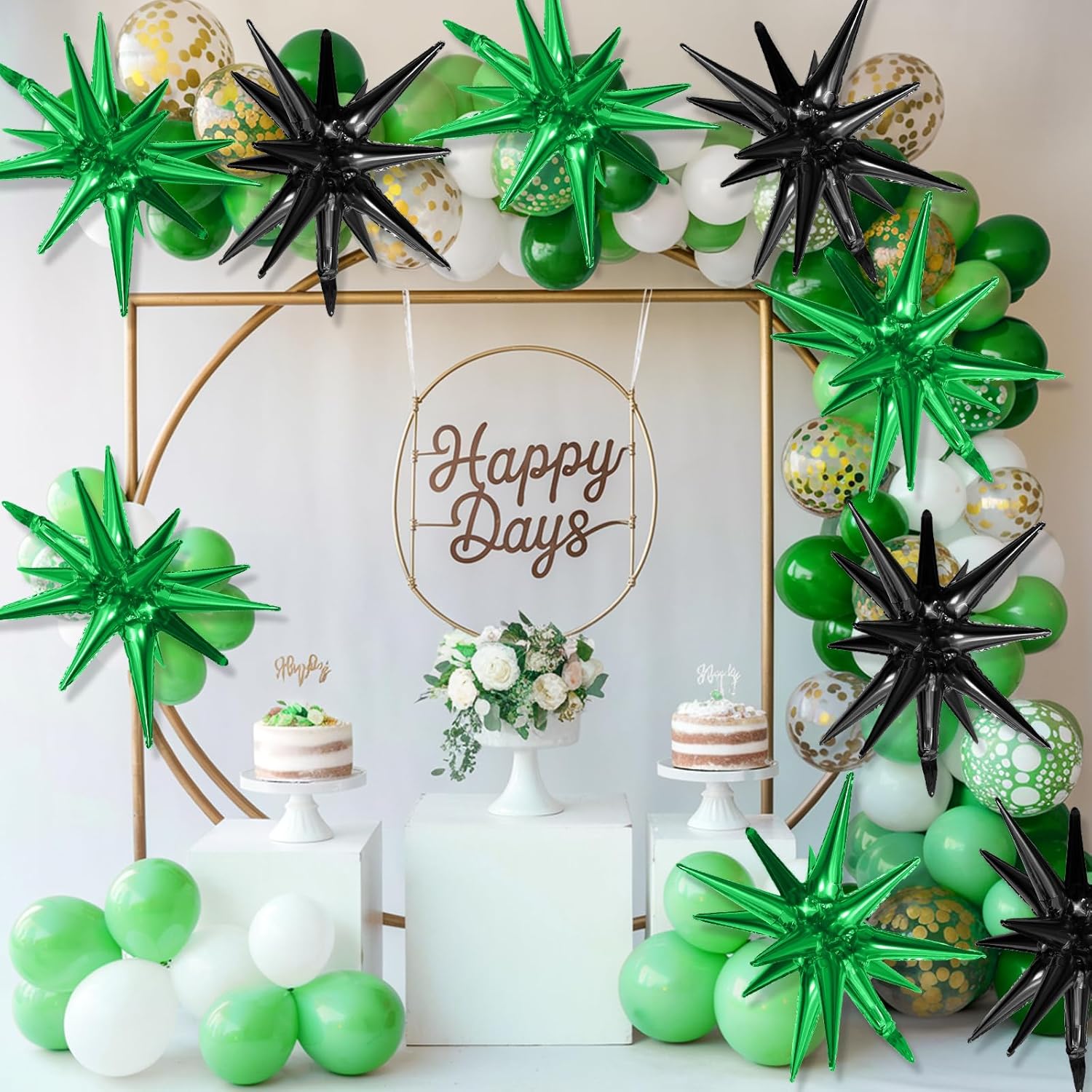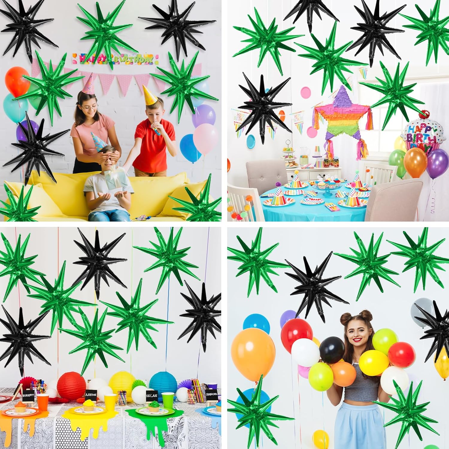• Black Green Star Balloons Set:Package include 9pcs 22Inch explosion star balloons(black x 4,green x 5).Large enough to help you better decorate your party.