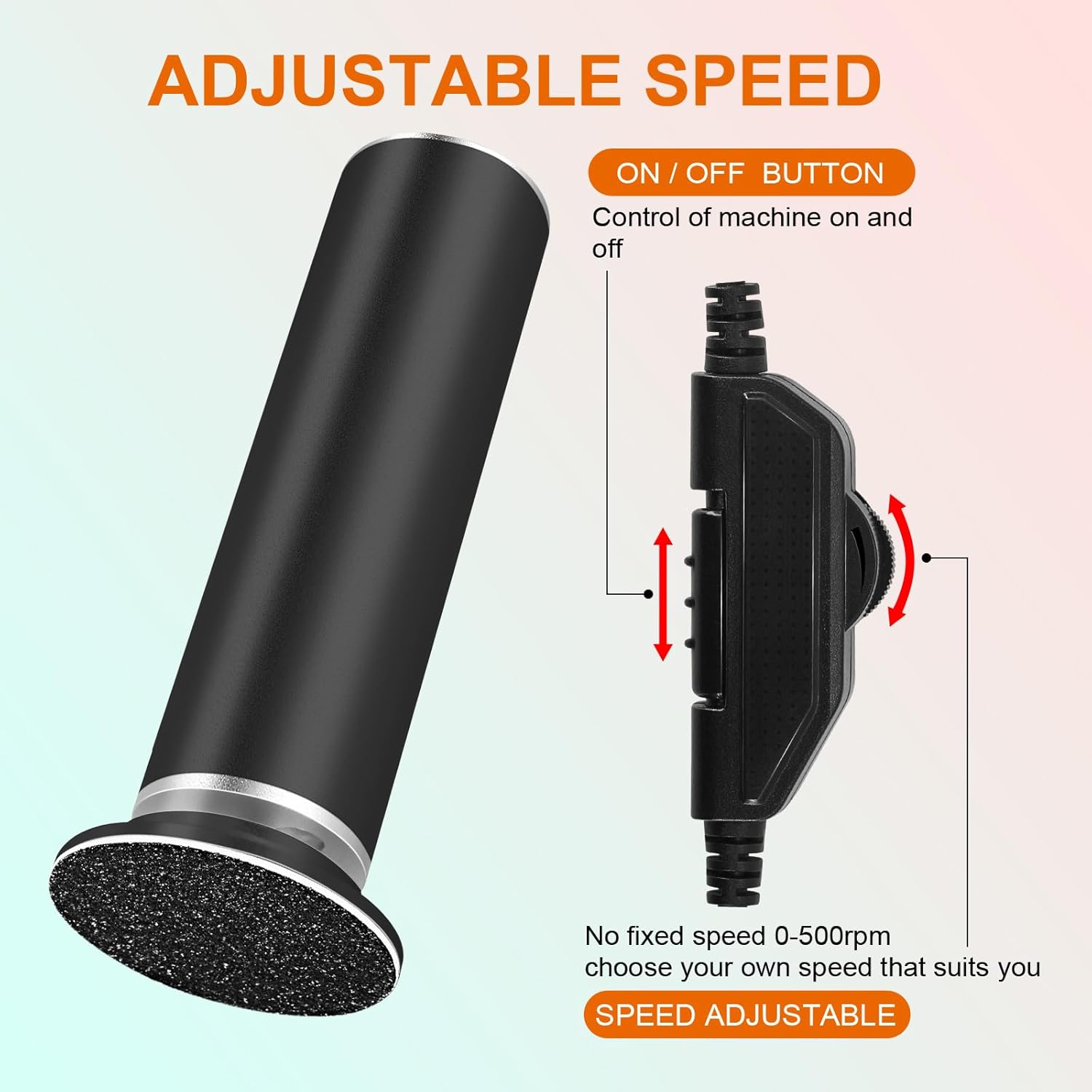 • ADJUSTABLE SPEED: Are you still using traditional electric feet callus remover with only 3 or 2 speeds? Our electric foot file sander has unlimited speeds, and you can adjust the speed within the speed range (0-500rpm) to suit yourself, removing dead skin from the heel more gently and smoothly.