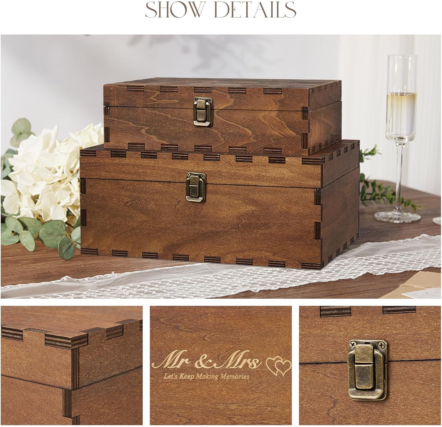 • Unique Design: Engraved "Mr & Mrs" on the outside lid, Smooth 90 degree vintage hinges lock the lid in an upright position, making it easier for you to store and retrieve items. A durable latch for security. Our beautifully wedding memory box is a sweet way to share your love