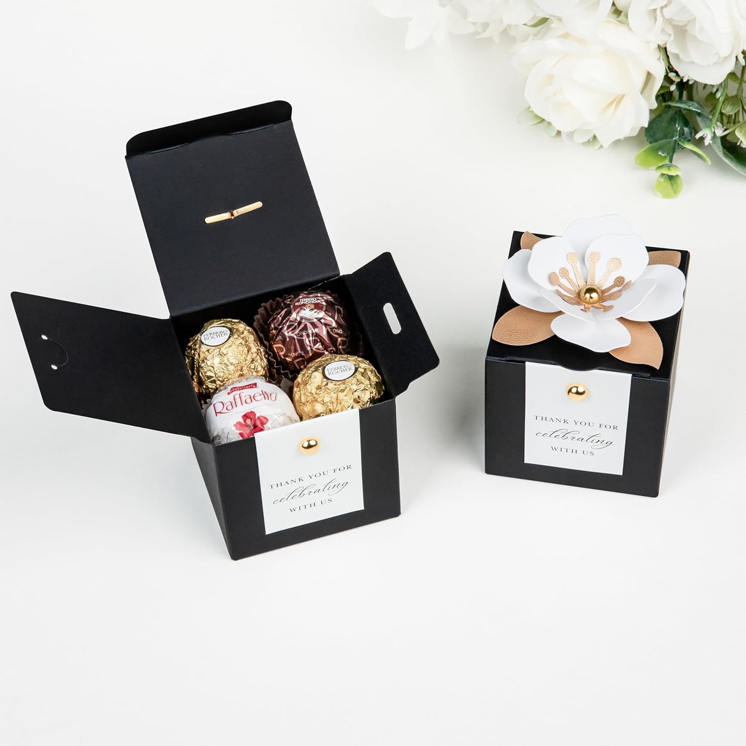 FEIYI 20 PCS Candy Boxes, 3 In 1 Black Favor Boxes with Floral Decor, White Thank You Tags Gift wrapping for Wedding Birthday Baby Shower Decorations Party -2.55x2.55x2.55''