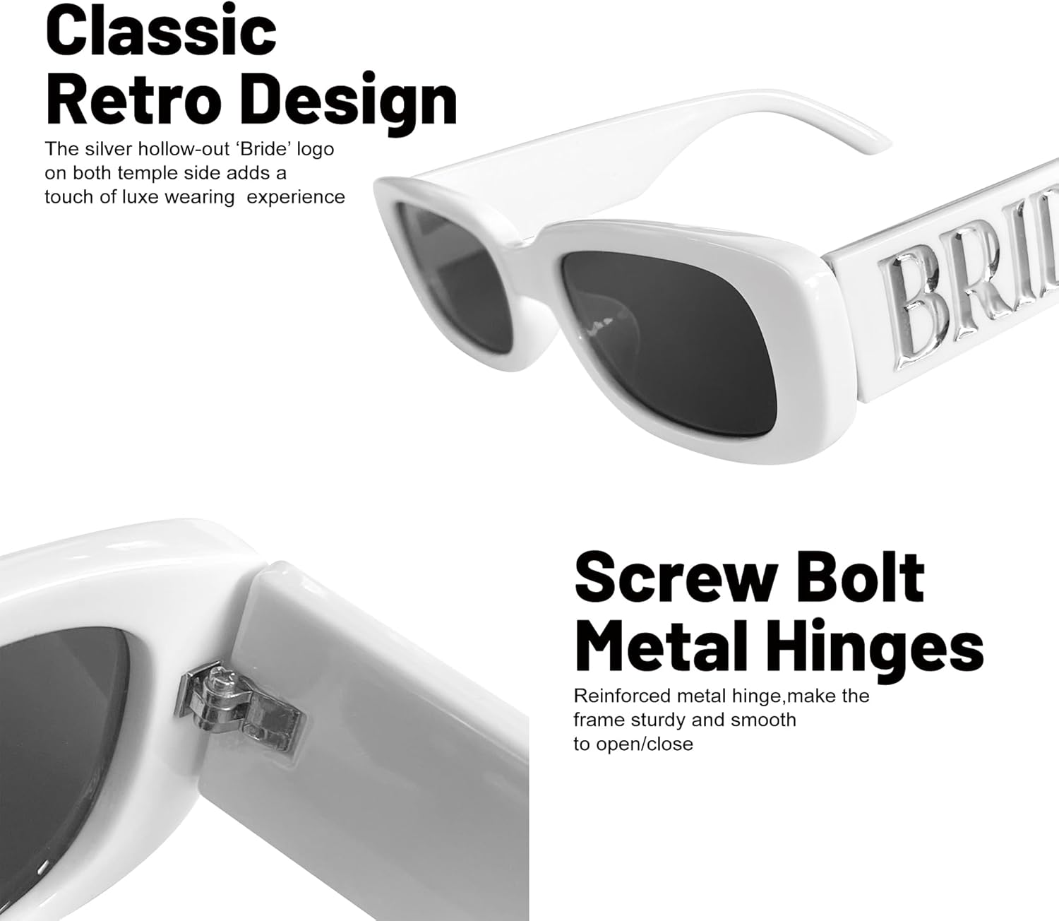 • High Quality Mateiral:Made with high quality plastic frames and reinforced metal hinges,offering flexibility without compromising longevity.The integrated nose pad eliminates pressure points, ensuring all-day comfort.Engineered to withstand frequent adjustments,these sunglasses retain their shape effortlessly,making them an ideal companion throughout your wedding journey.