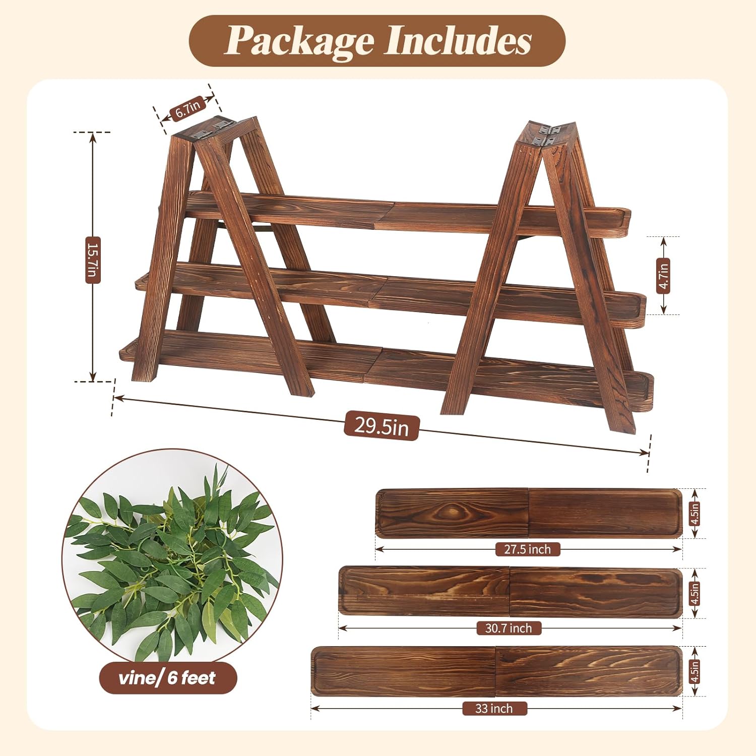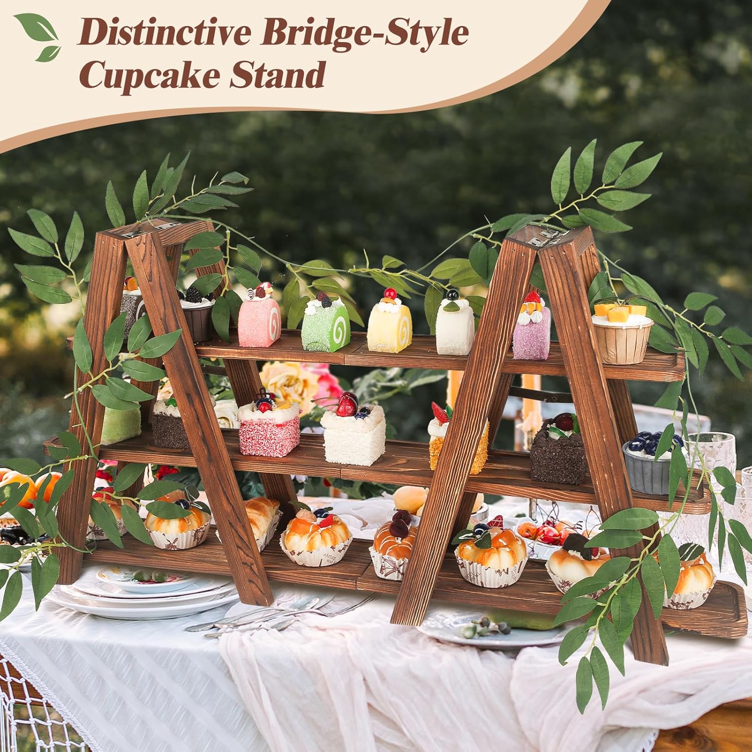 Wooden 3-Tier Cupcake Stand with Removable Trays & Vine Decoration – Foldable Party Display Serving Ladder with Platter for Cake, Snacks, Fruits, Chips, Bread