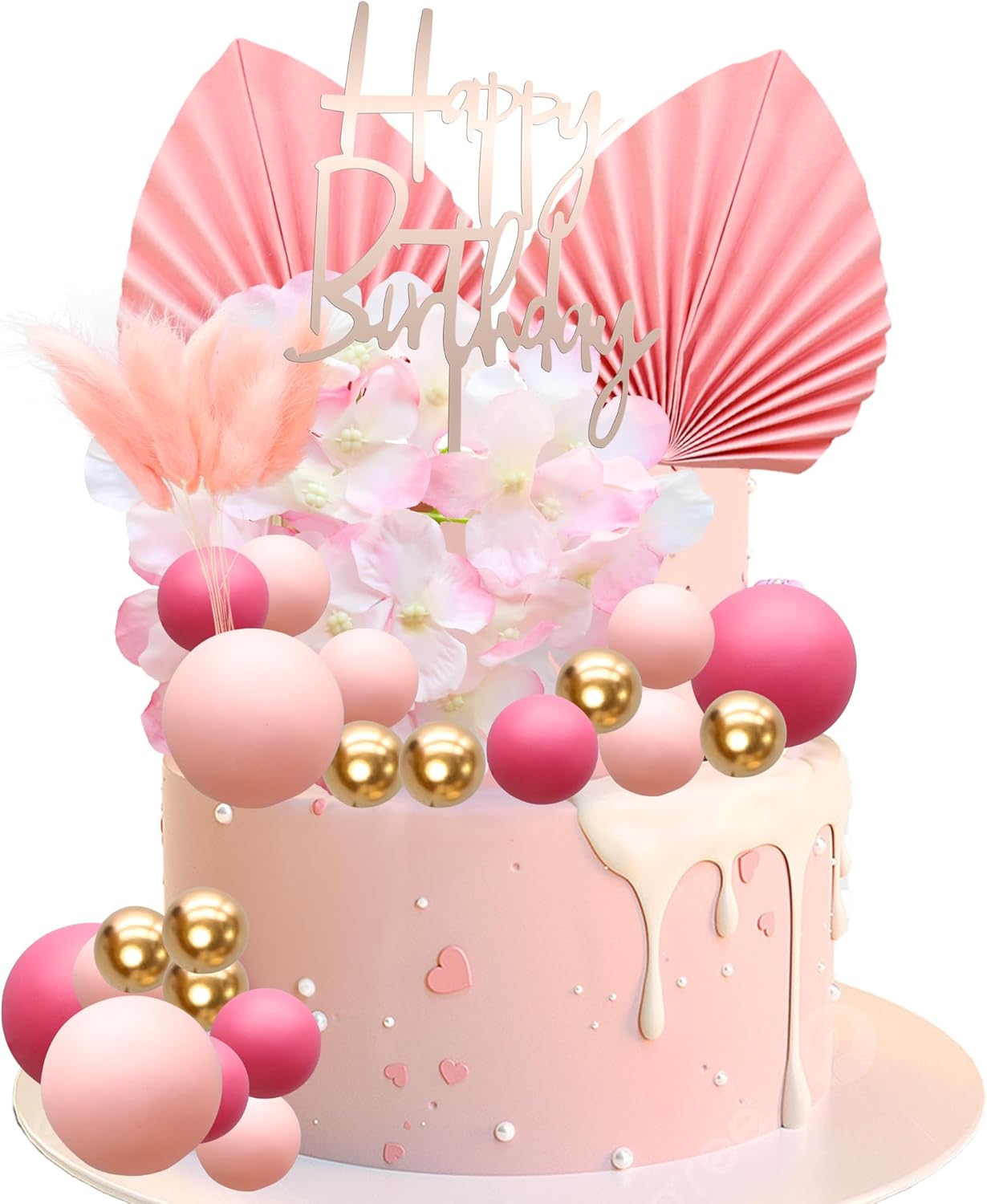 Gyufise 29Pcs Rose Red Artificial Flower Cake Decorations Acrylic Happy Birthday Cake Topper Balloon Cake Toppers Palm Fan Cake Picks for DIY Wedding Birthday Valentine's Day Party Supplies