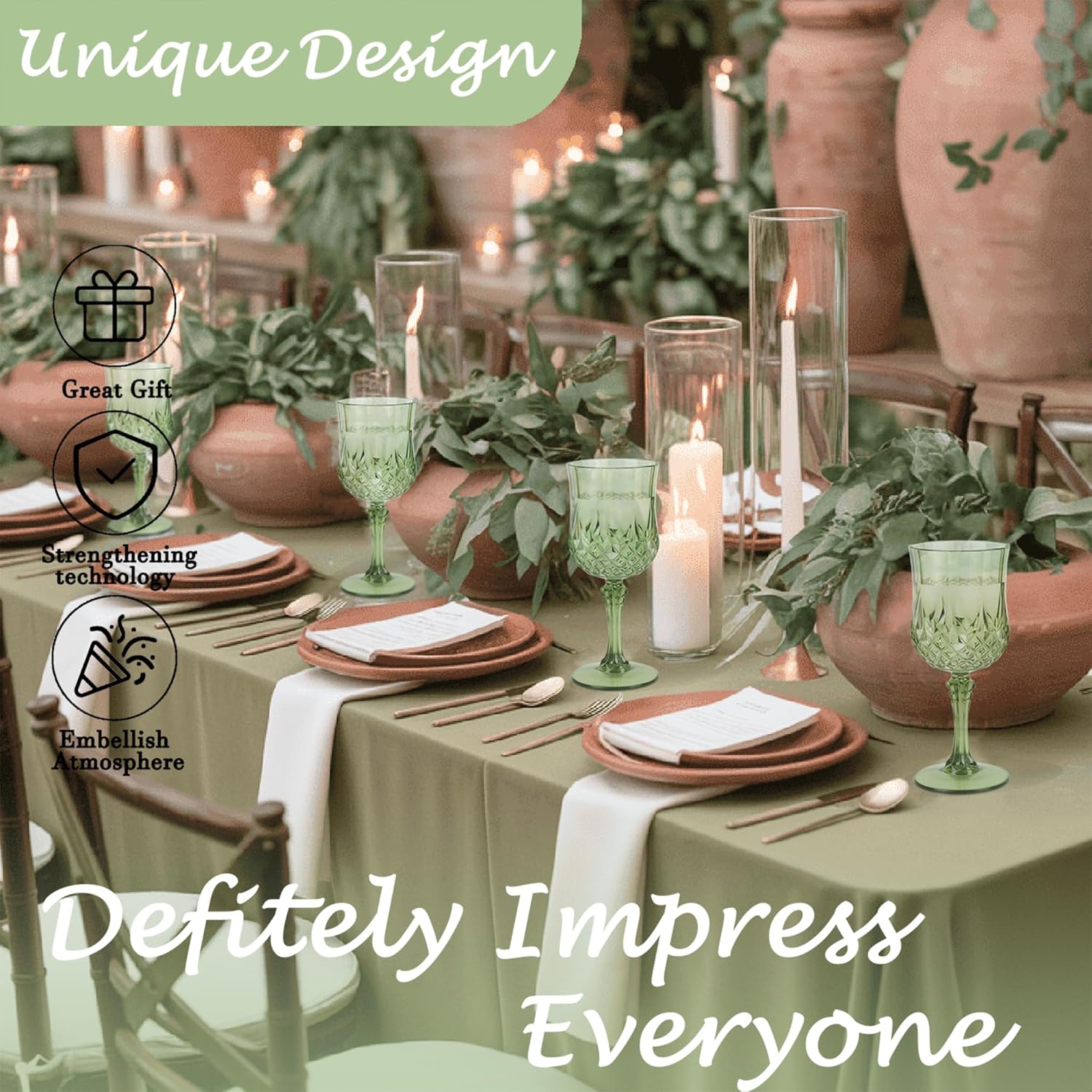 • 🍷🍷🍷【Product Description】 This set includes 12 retro-style light green party plastic wine glasses, providing ample quantity to meet your daily use and replacement needs. The elegant and sophisticated design makes your wedding reception unique