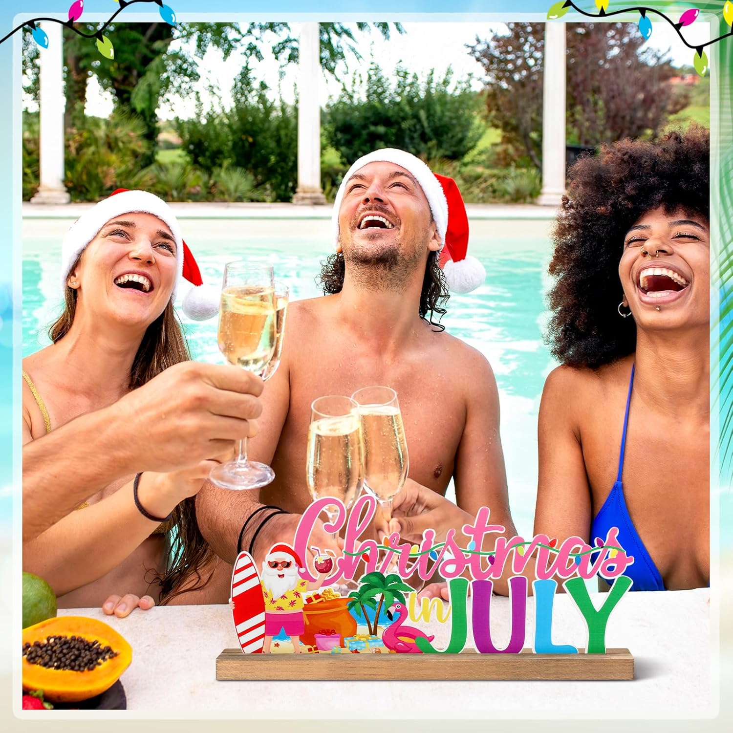 Christmas in July Metal Sign Rustic Table Decor Holiday Tiered Tray Decor with Wooden Base Freestanding Metal Word Sign for Home Tabletop Centerpiece Mantel Shelf Fireplace