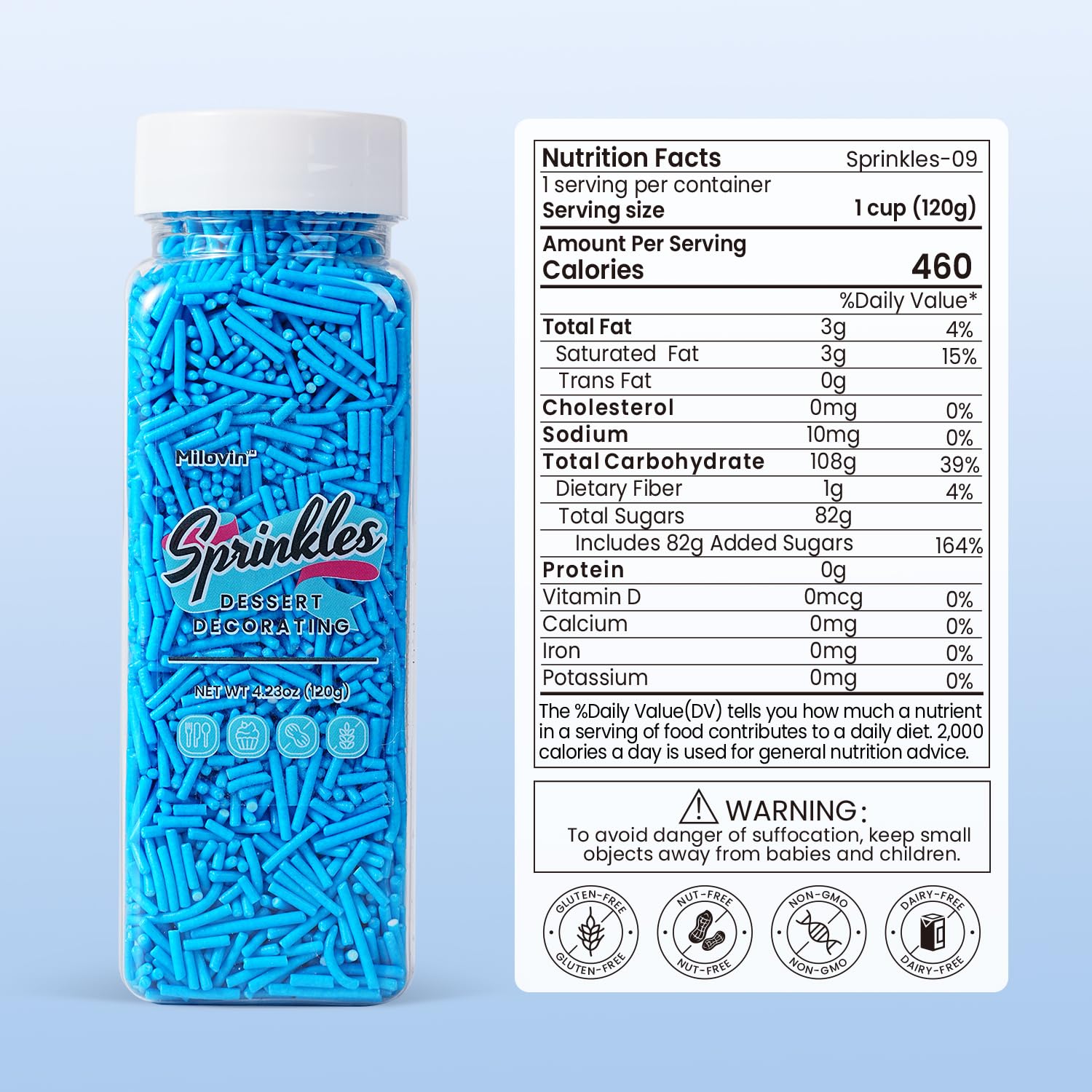• High Quality and Safe: Made with food-grade ingredients. Edible, Gluten-free, Nut-free, Dairy-free, Non-GMO. Our blue jimmies sprinkles meet American food standards and guard your and your family's health