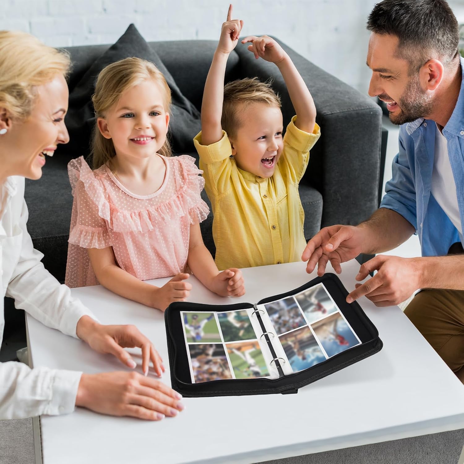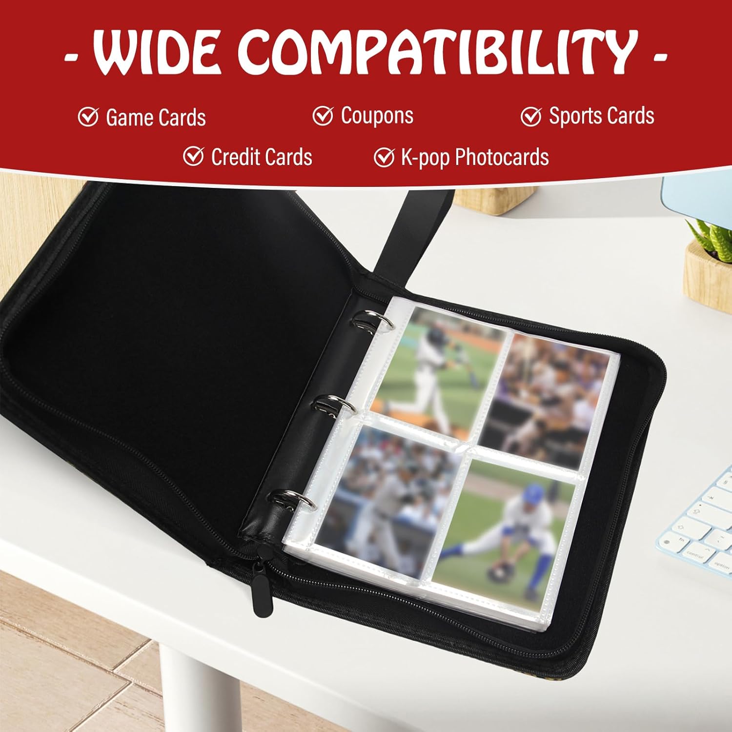 • Large Capacity Size: Inside page size: 2.68*3.5in,The card binder comes with 50 removable sleeves, which can hold up to 400 trading cards with 4 pockets on each side, allowing you to store cards on both the front and back.The trading card binder case is compatible with svarious standard-sized cards, Game Card , Football cards, Baseball cards