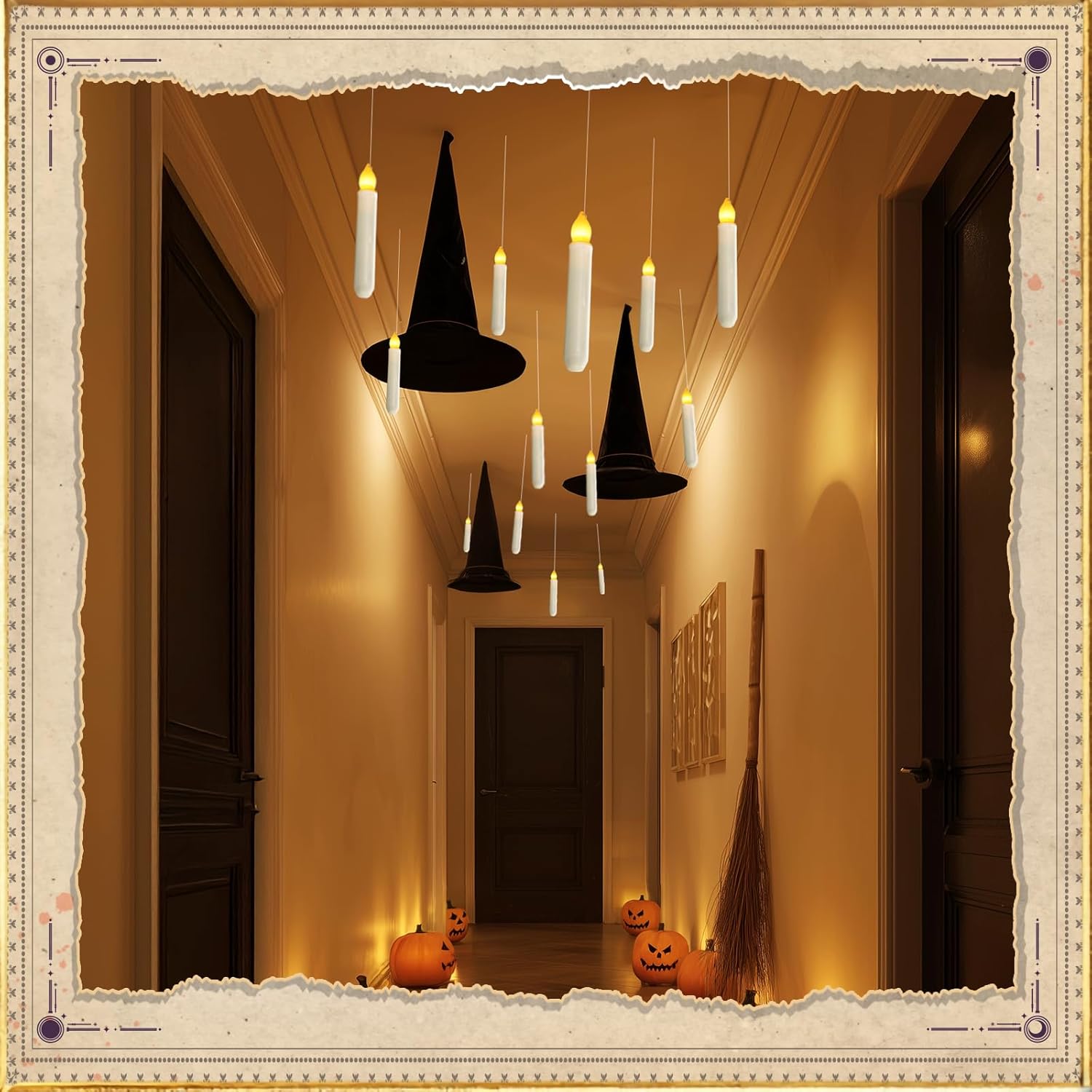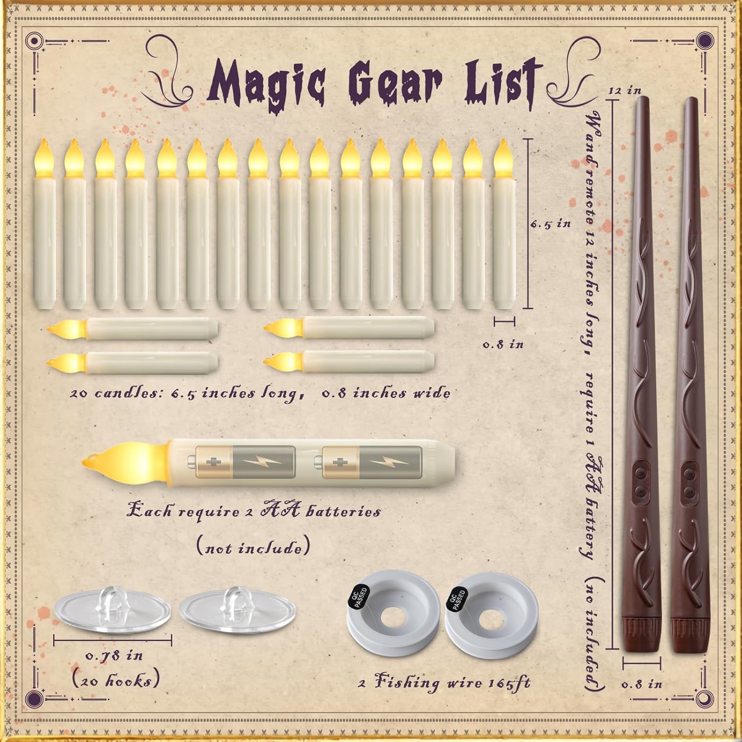 • Never received a letter from magic school? but it doesn't matter! You will receive 20 pcs hanging floating candles, an easy hanging kit with 2 wand remote range of 45 ft/10 meters which can switch these flickering flameless taper candles on and off simultaneously just like magic. Set these candles in your house, and with just one click, together with some spells and movements, you are a witch!