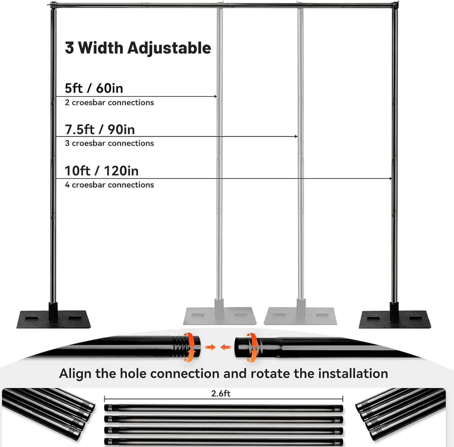 • Package Includes: The photo backdrop stand kit includes 2 bases, 4 cross bars, 8 straight pipes, 2 hex wrenches, 4 ground anchors, 1 carry bag. You can easily take the party backdrop stand anywhere you want!