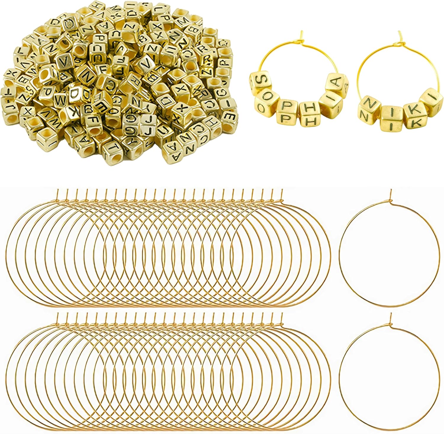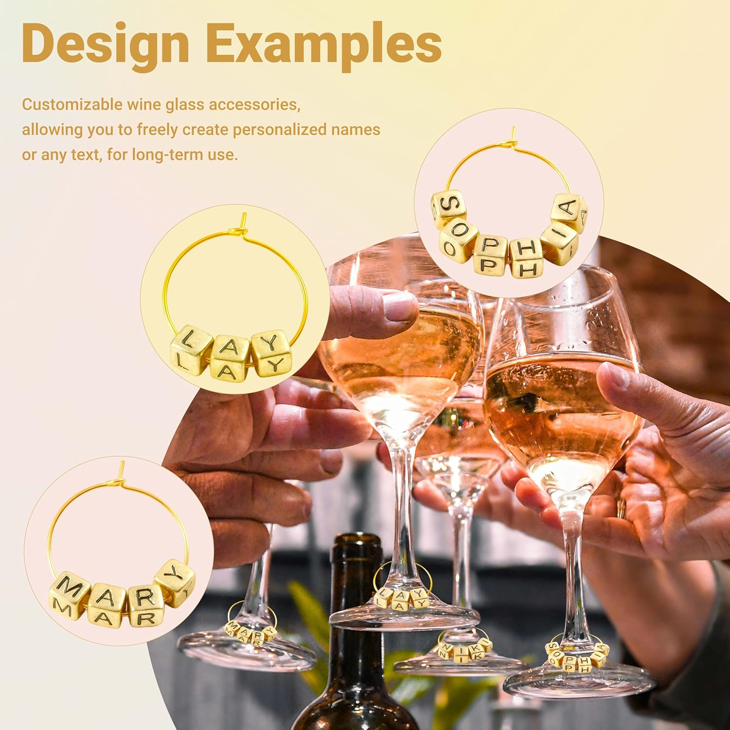 • DIY Wine Charms Kit: 300 distressed gold square letter beads + 50 KC gold-plated hoops (1-inch diameter) create name tags or phrases like "Cheers" for drinkware identification