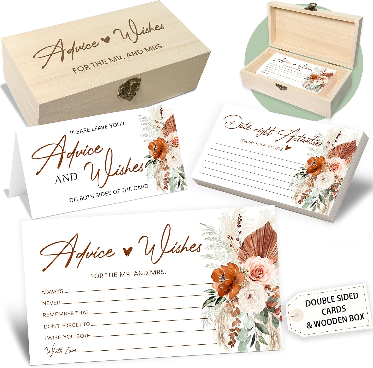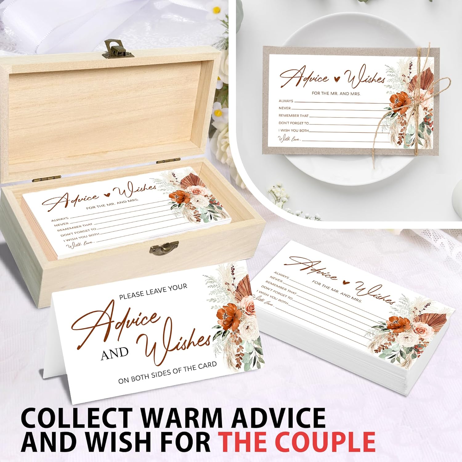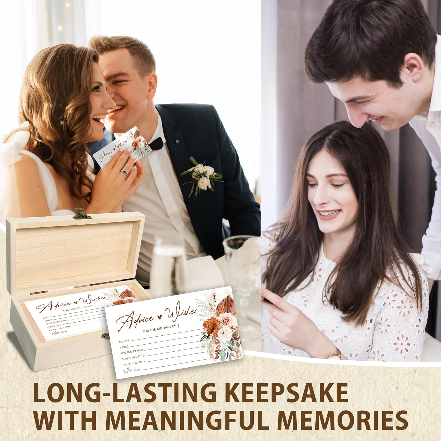 • Set Includes: Elevate your celebration with our deluxe set that includes 50 Pcs marriage wishes cards, an advice and wishes box for couples wedding shower decorations