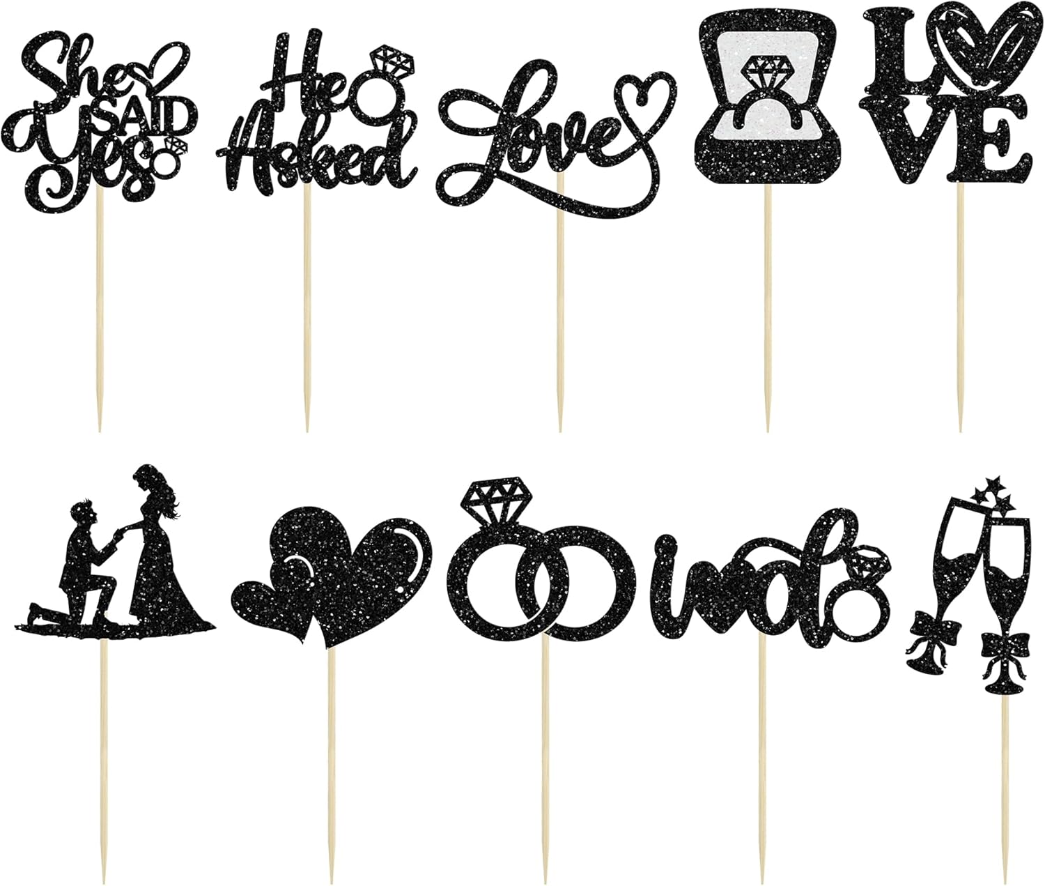 Ephlyn 30Pcs He Asked She Said Yes Cupcake Toppers Glitter Engagement Cupcake Toppers Diamond Ring Heart Love I Do Cupcake Picks for Engagement Wedding Party Cake Decorations Black
