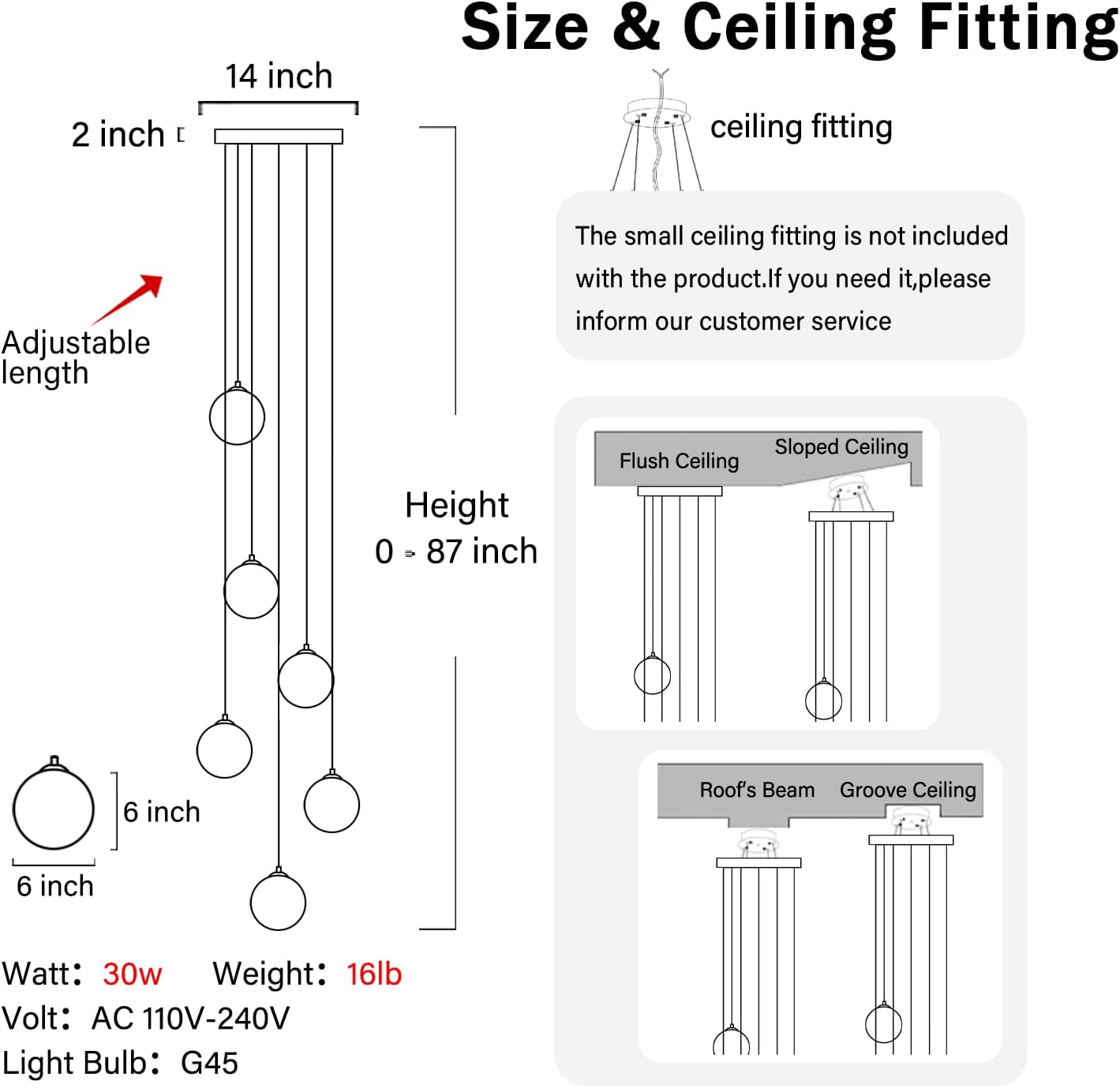 • 【Glass Chandelier Size】Chandelier ceiling plate diameter: 14 inch, Chandelier max height: 87inch.Crystal size:W 6inch * H 6inch,The chandelier weighs about 16LB.Wide voltage drive application range: AC 85-265 volts