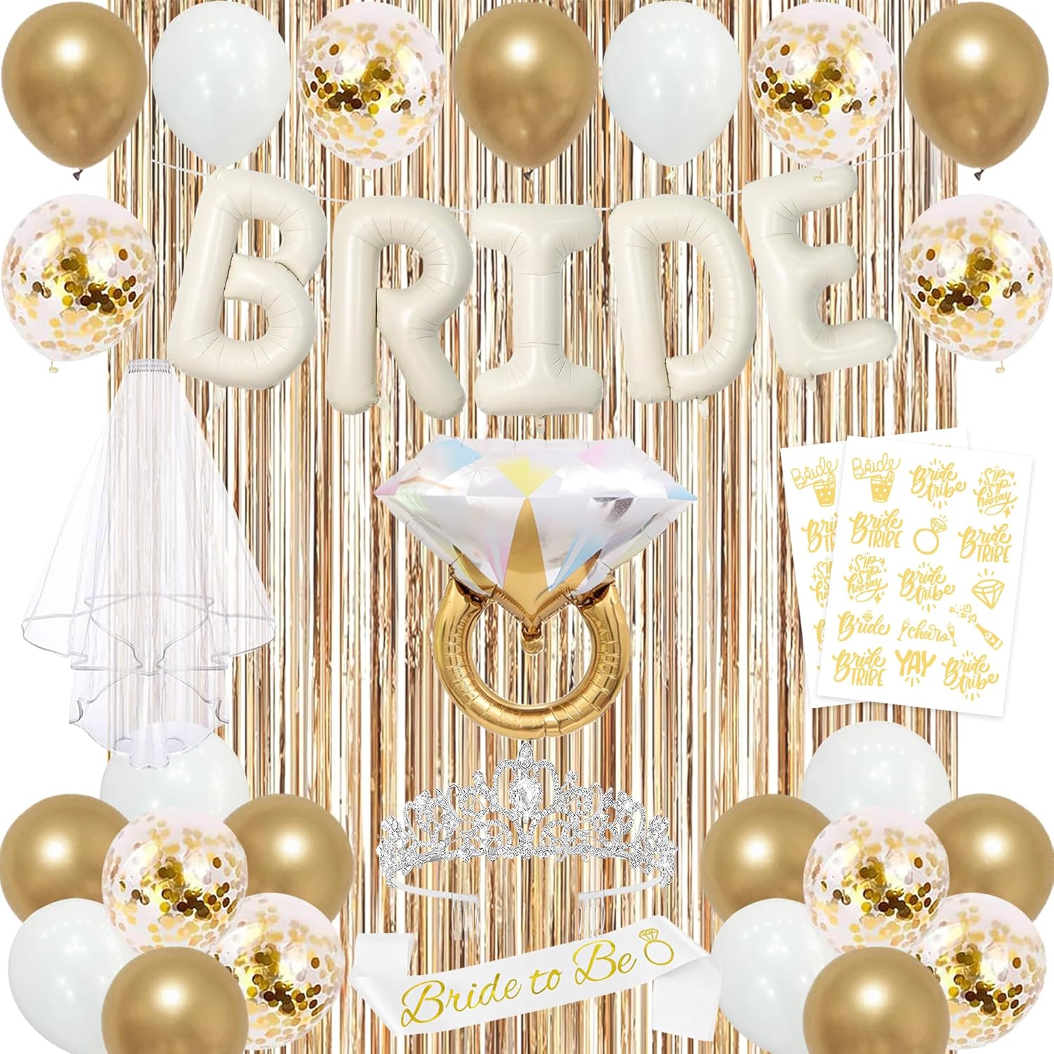• [Bride to Be Decorations Set] Package Included:1pc champagne gold "bride to be" banner, bridal shower crown,1pc ring foil balloon, 14pcs balloons, 2pcs Fringe Curtains, 2pcs bride to be themed tattoo sticker,the bachelorette party sash "bride to be" is made of premium satin and the white veil is made of soft tulle, with a double layer design and edge cascading.