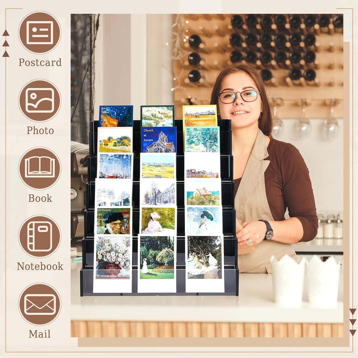 • Impressive Dimensions: our greeting card display stand boasts an overall size of about 16.14 x 14.96 x 12.60 inches, providing an ideal fit on your counter's pace; Each of its 6 tiers are about 2.8 inches high and 2 inches wide
