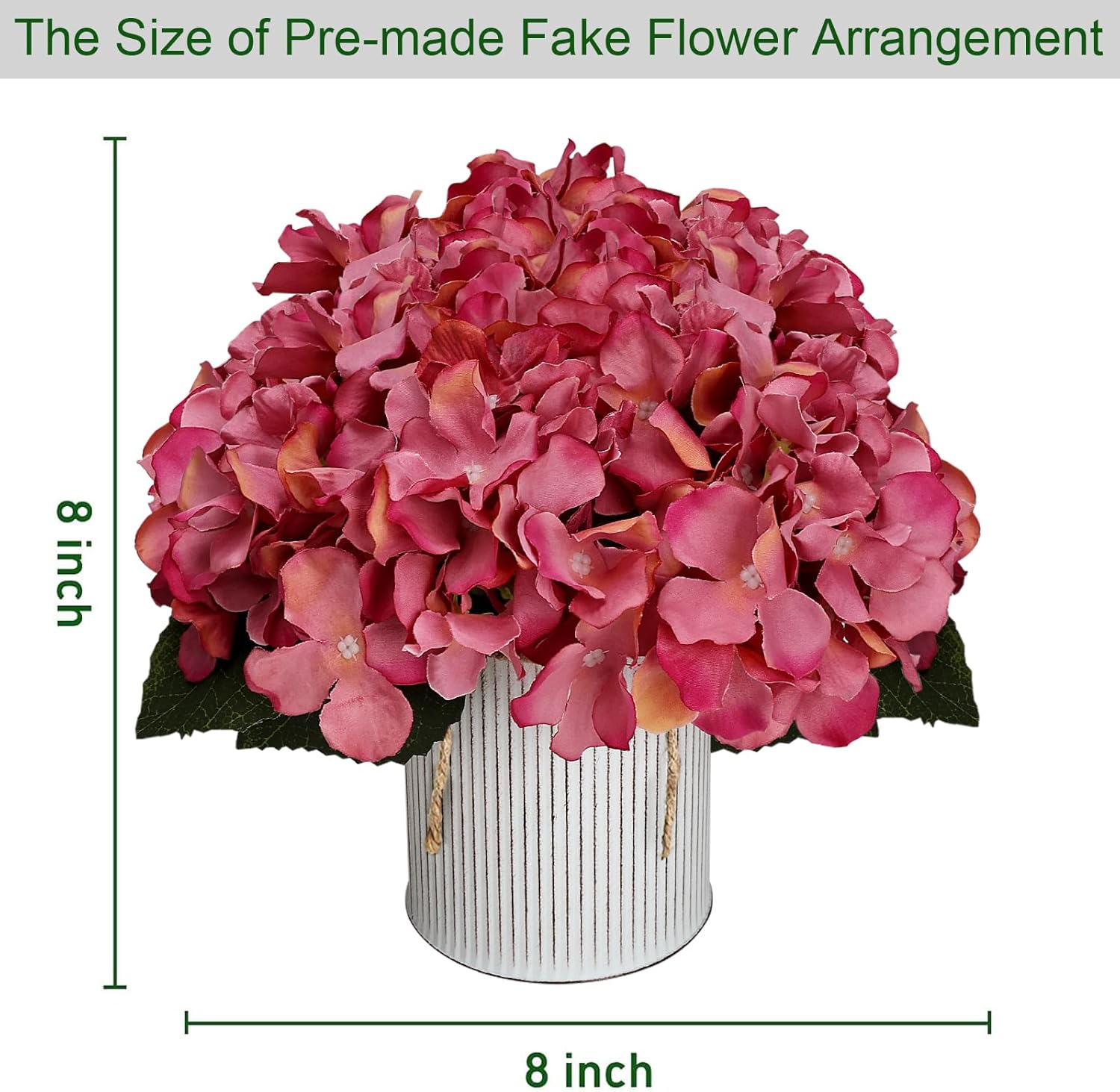 • Pack of 6 pre-made artificial flowers with rustic metal pot for table centerpieces. Consists of high quality dusty pink fake roses and faux hydrangeas.