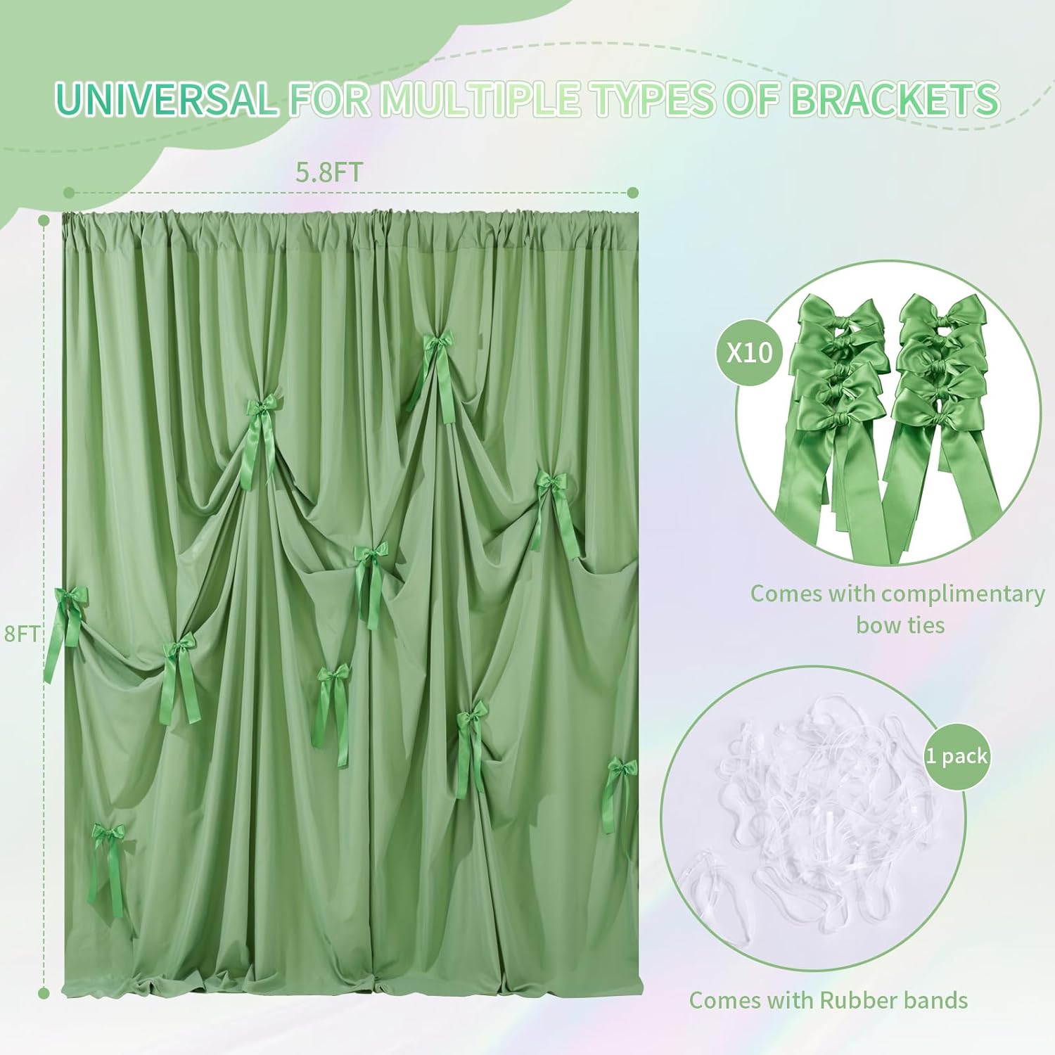• 【Package Includes】: Included a panel 5.8x8ft polyester background, 10 double - sided satin bows and a pack of rubber bands, let you DIY your own unique decoration!