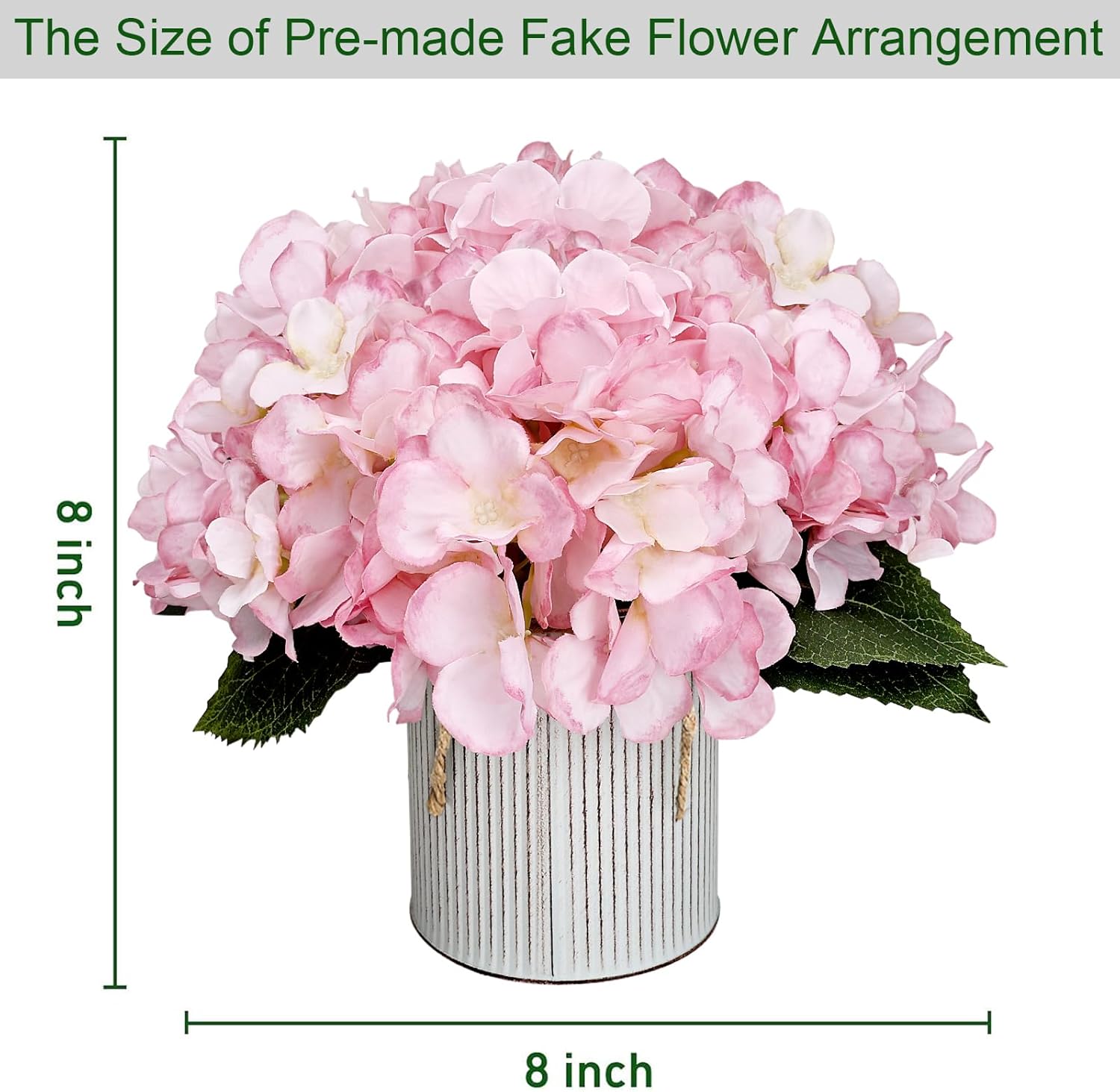 • Pack of 6 pre-made artificial flowers with rustic metal pot for table centerpieces. Consists of high quality pink fake roses and faux hydrangeas.