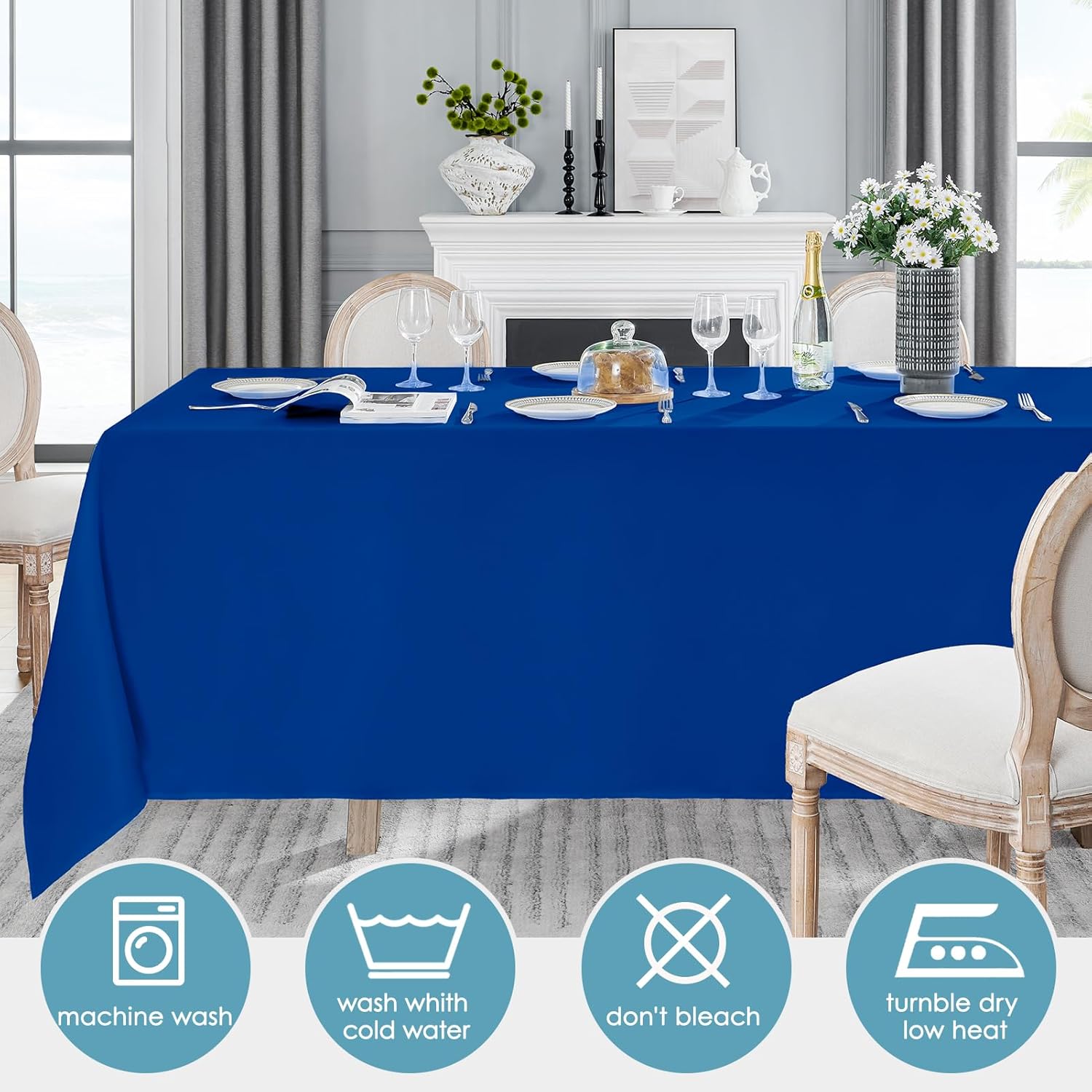 • Durable and Easy to Care: High quality polyester material makes the royal blue tablecloth is durable, stains will not invade, and does not deform or shrink, while eliminating the problem of hand washing, machine wash and dry in cold water