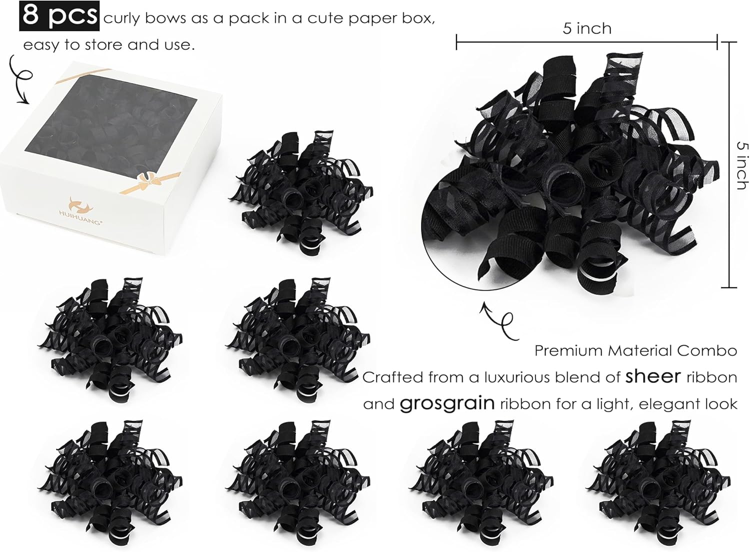 • SIZE & PACK: Each package contains 8 pcs black curly bows, and made from 12 strands of 3/8" wide grosgrain and sheer satin ribbon that adds a airy, elegance and luxurious feel to any gift or decoration. Bows measures 5"~5.5" wide