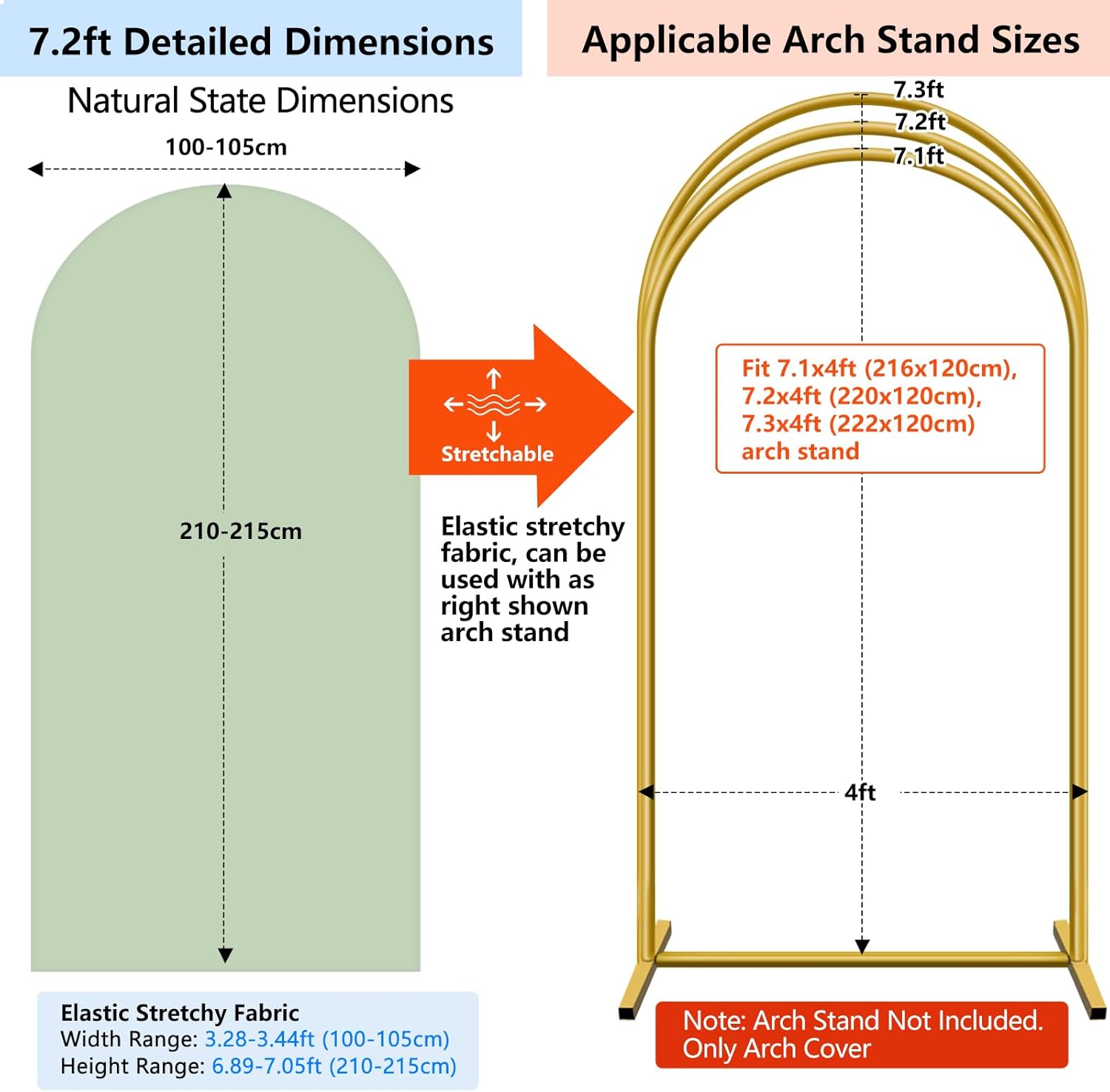 • Applicable Arch Stand Size: The arch cover has good elasticity, and the natural size range is 6.89-7.05 ft high and 3.28-3.44 ft wide. It can be used for arches with a height of 7.1 ft to 7.3 ft and a width of 4 ft. ⚠️Note: Arch stand is not included