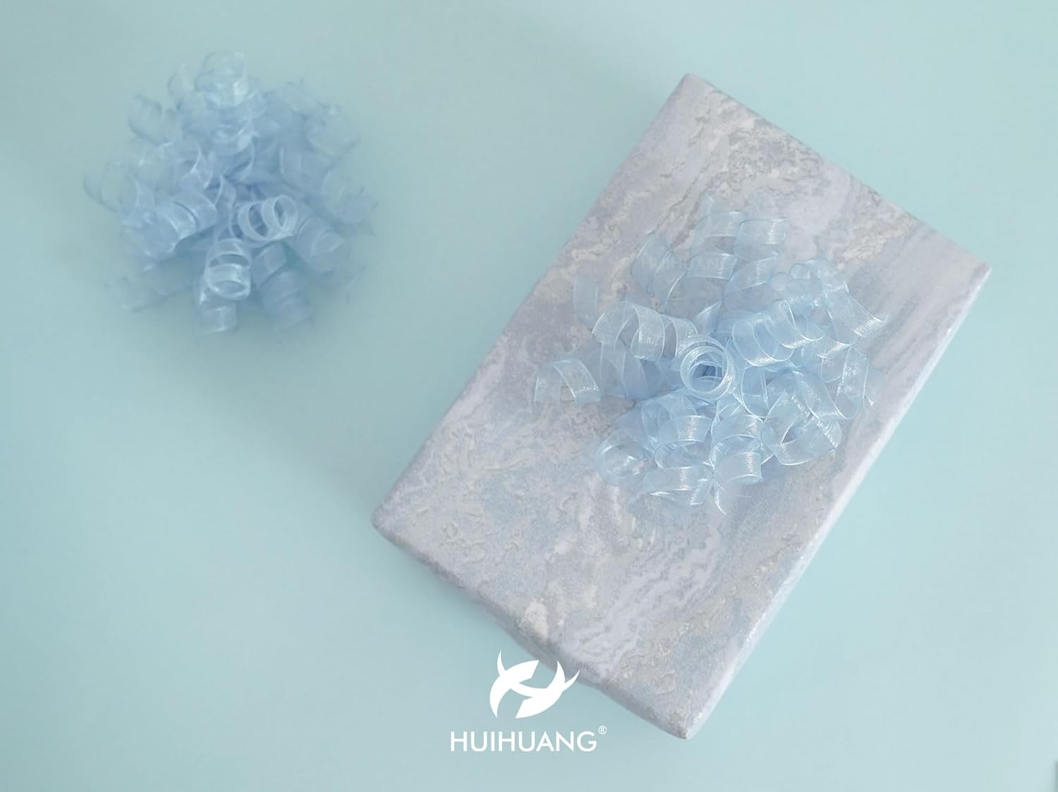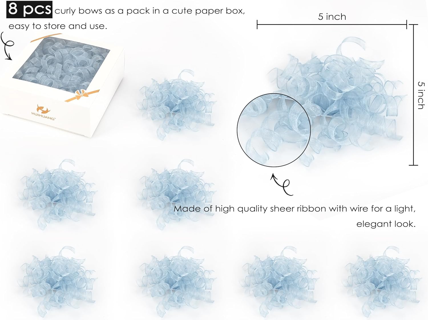 • SIZE & PACK: Each package contains 8 pcs dusty blue curly bows, and made from 12 strands of 3/8"(9mm) wide sheer ribbon that adds a light, airy, and luxurious feel to any gift or decoration. Bows measures 5"~5.5" wide, create a dramatic and burst effect, making it ideal for large gift boxes, baskets, and decorations