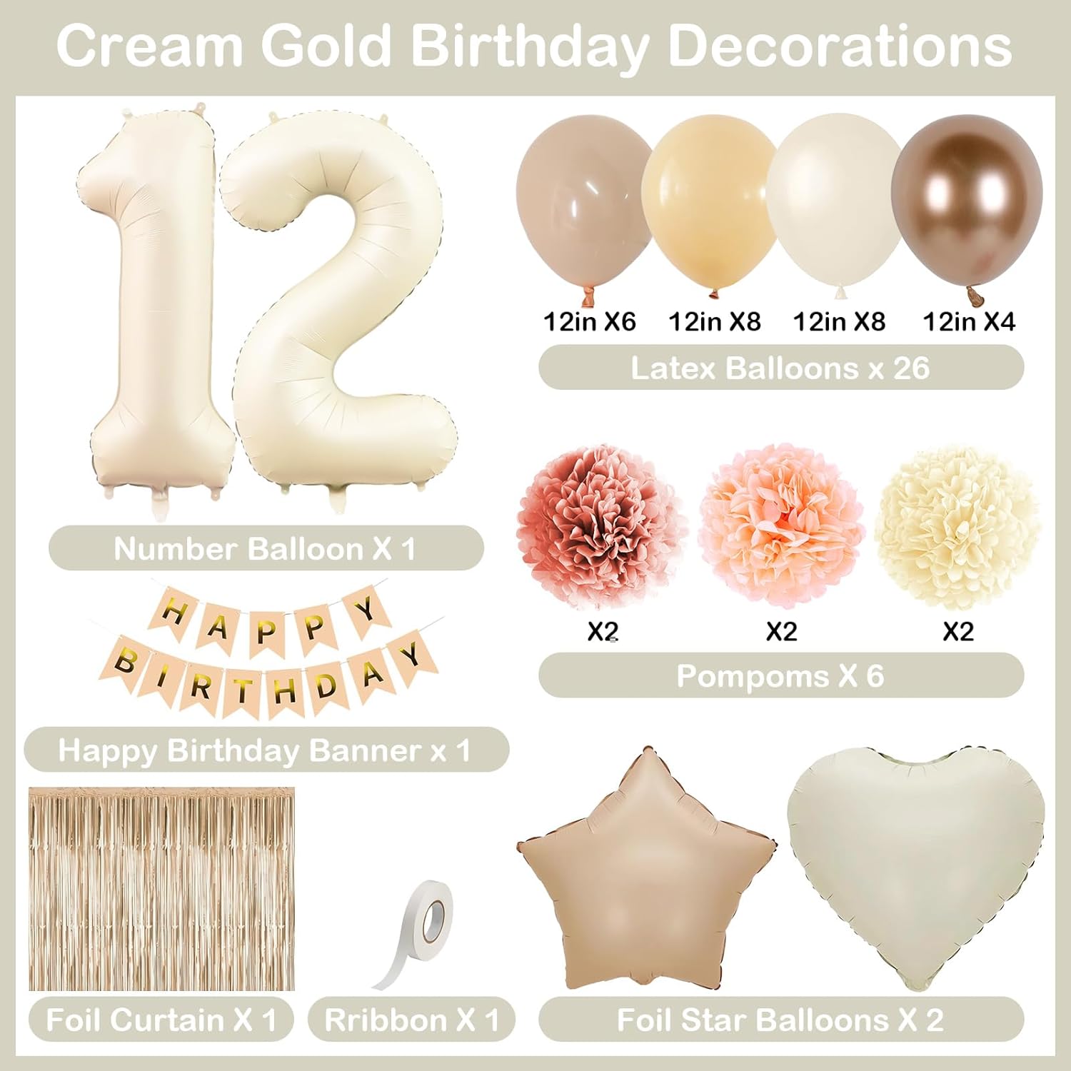 • PACKAGE INCLUDES: 1pc beige 12 number balloon, 1pc happy birthday banner, 2pcs dusty pink paper pom poms, 2pcs blush paper pom poms, 2pcs nude paper pom poms, 1pc champagne gold fringe curtain, 1pc caramel star foil balloons, 1pc cream heart foil balloons, 8pcs nude balloons, 6pcs blush balloons, 8pcs beige balloons, 4pcs champagne gold balloons, 1pc ribbon