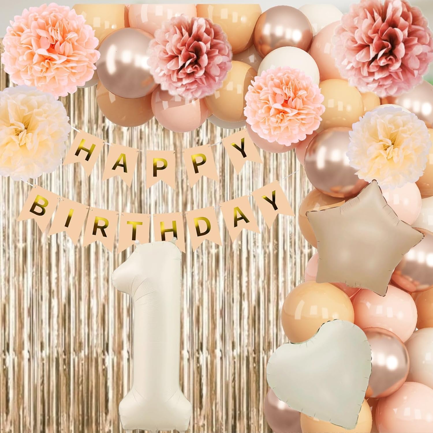 • ALL-IN-ONE DECORATION: Comes with a β€œ1” foil number balloon, includes everything you need: birthday banner, fringe curtain, blush cream gold balloons, star foil balloons, paper pom poms, and ribbon, ideal for 1 year old birthdays, 1st birthday party, photo shoots, and family gatherings, suits both indoor and outdoor setups