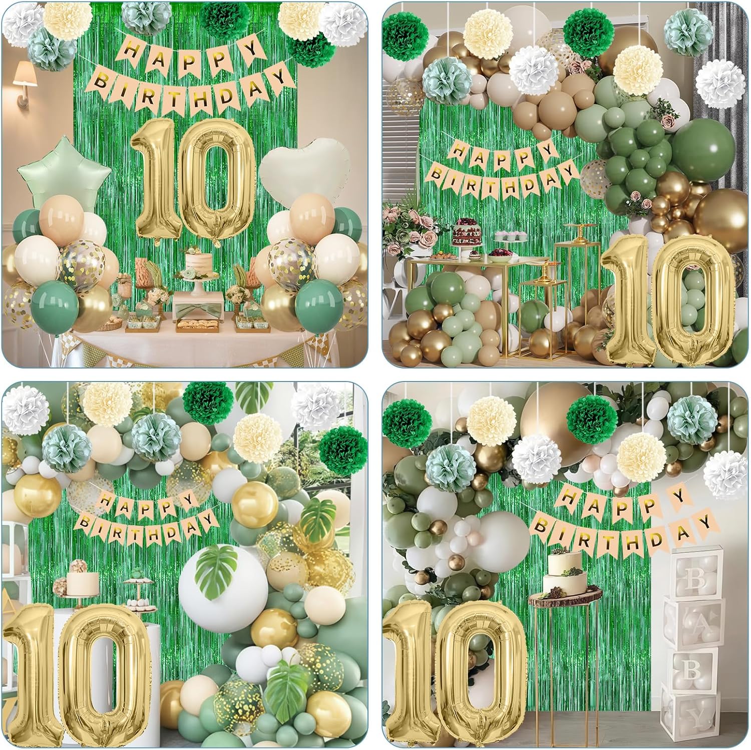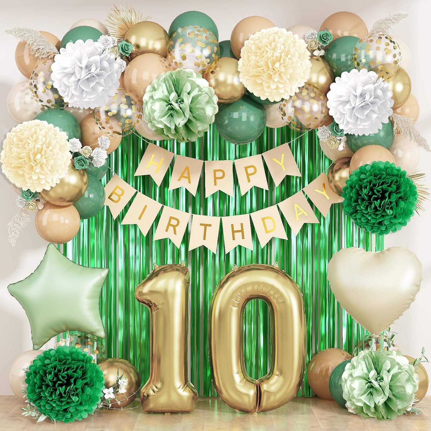 • PACKAGE INCLUDES: 1pc gold 10 number balloon, 1pc happy birthday banner, 2pcs deep green paper pom poms, 2pcs sage green paper pom poms, 2pcs nude paper pom poms, 2pcs white paper pom poms, 1pc green fringe curtain, 1pc olive green star foil balloons, 1pc cream heart foil balloons, 6pcs nude balloons, 6pcs sage green balloons, 6pcs beige balloons, 4pcs metallic gold balloons, 4pcs gold confetti balloons, 1pc ribbon