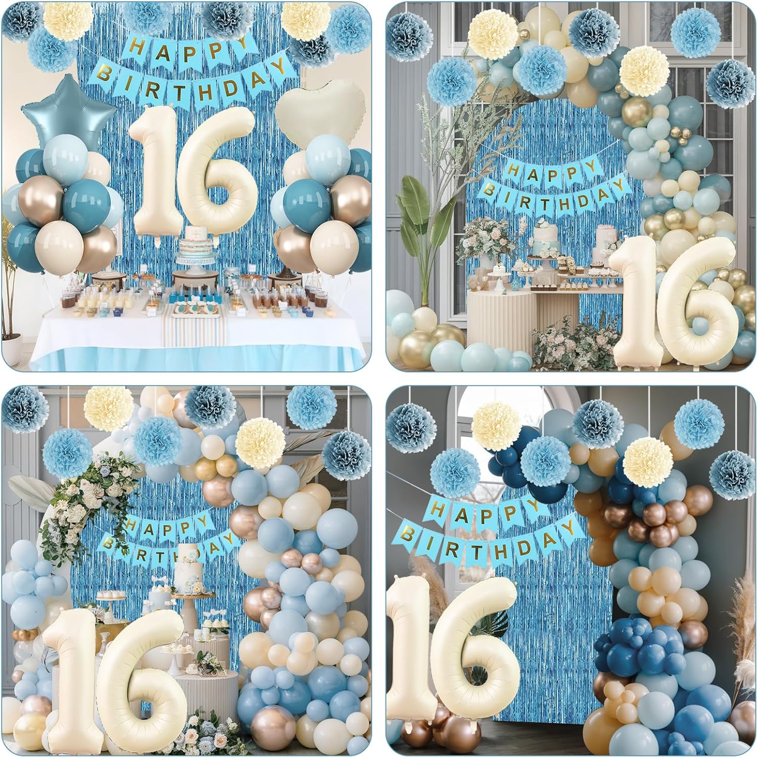 • ALL-IN-ONE DECORATION: Comes with a “16” foil number balloon, includes everything you need: birthday banner, fringe curtain, blue beige gold balloons, star foil balloons, paper pom poms, and ribbon, ideal for 16 year old birthdays, 16th birthday party, photo shoots, and family gatherings, suits both indoor and outdoor setups