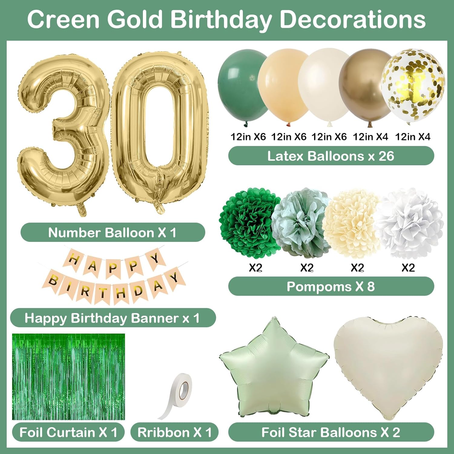 • PACKAGE INCLUDESο»Ώ: 1pc gold 30 number balloon, 1pc happy birthday banner, 2pcs deep green paper pom poms, 2pcs sage green paper pom poms, 2pcs nude paper pom poms, 2pcs white paper pom poms, 1pc green fringe curtain, 1pc olive green star foil balloons, 1pc cream heart foil balloons, 6pcs nude balloons, 6pcs sage green balloons, 6pcs beige balloons, 4pcs metallic gold balloons, 4pcs gold confetti balloons, 1pc ribbon