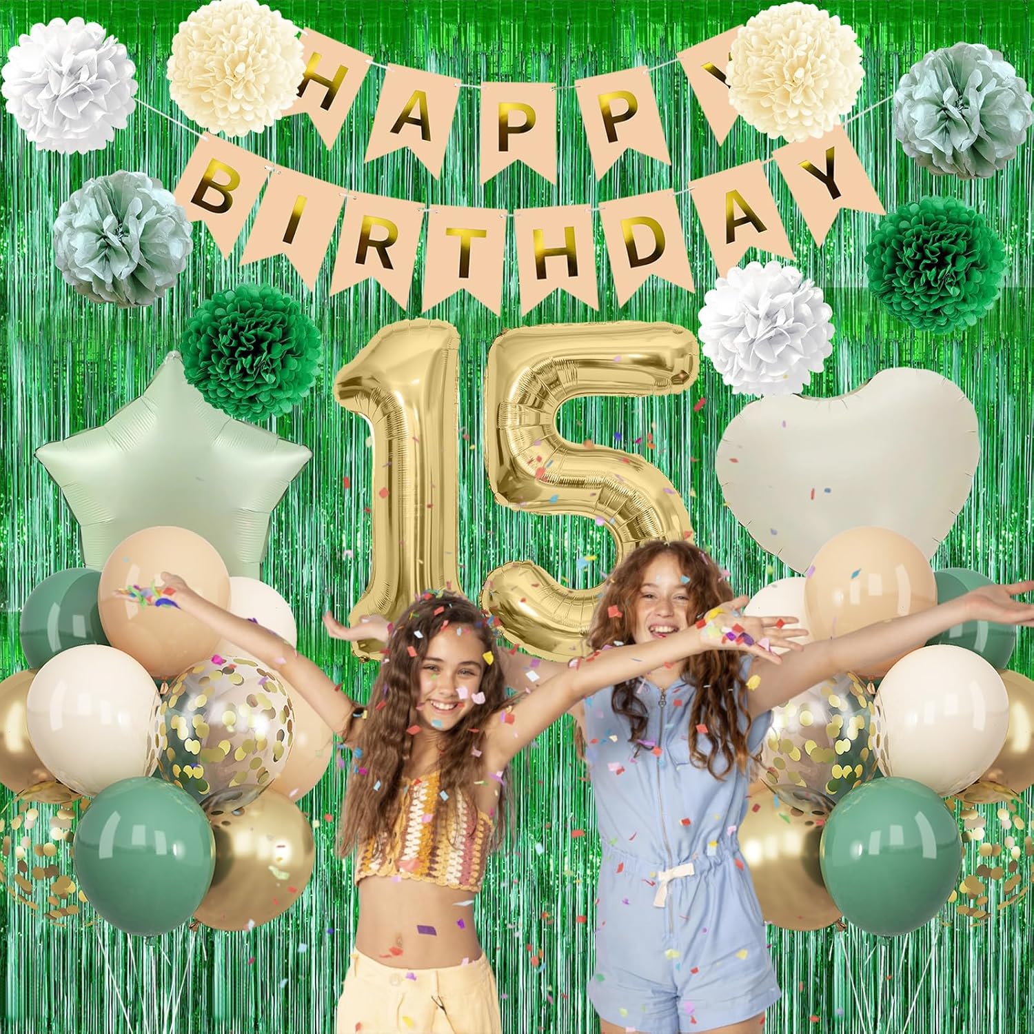 • ALL-IN-ONE DECORATION: Comes with a “15” foil number balloon, includes everything you need: birthday banner, fringe curtain, sage green gold balloons, star foil balloons, paper pom poms, and ribbon, ideal for 15 year old birthdays, 15th birthday party, photo shoots, and family gatherings, suits both indoor and outdoor setups