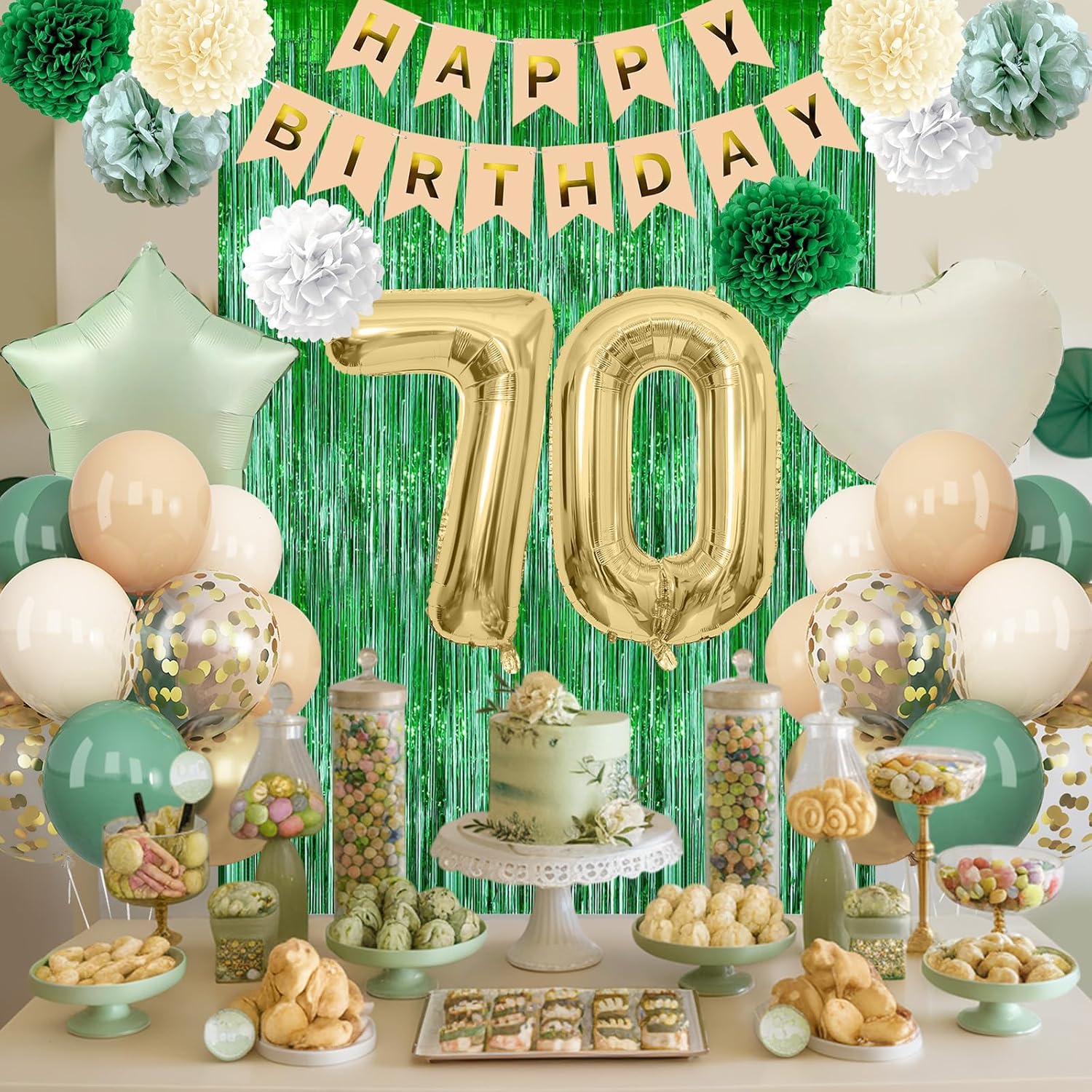 • ALL-IN-ONE DECORATION: Comes with a β€œ70” foil number balloon, includes everything you need: birthday banner, fringe curtain, sage green gold balloons, star foil balloons, paper pom poms, and ribbon, ideal for 70 year old birthdays, 70th birthday party, photo shoots, and family gatherings, suits both indoor and outdoor setups