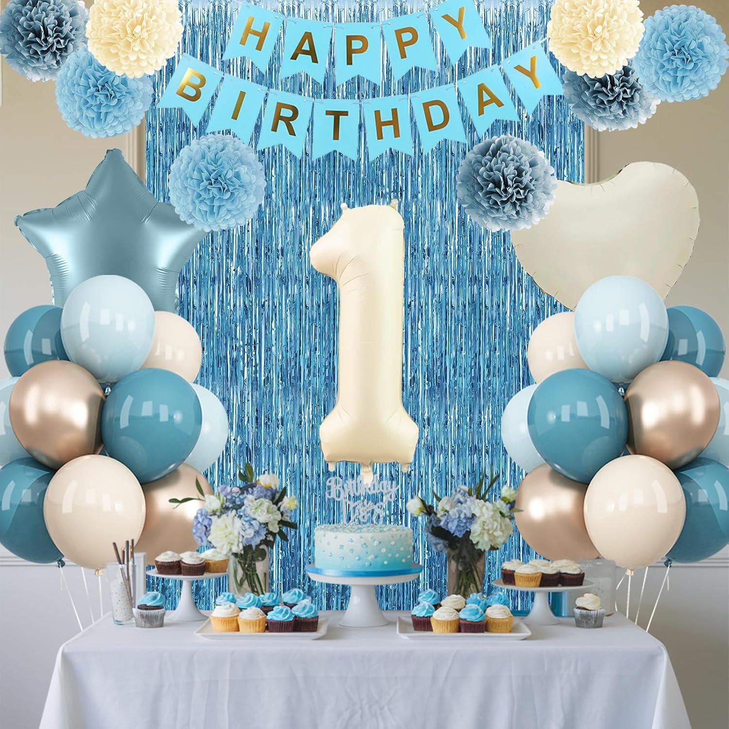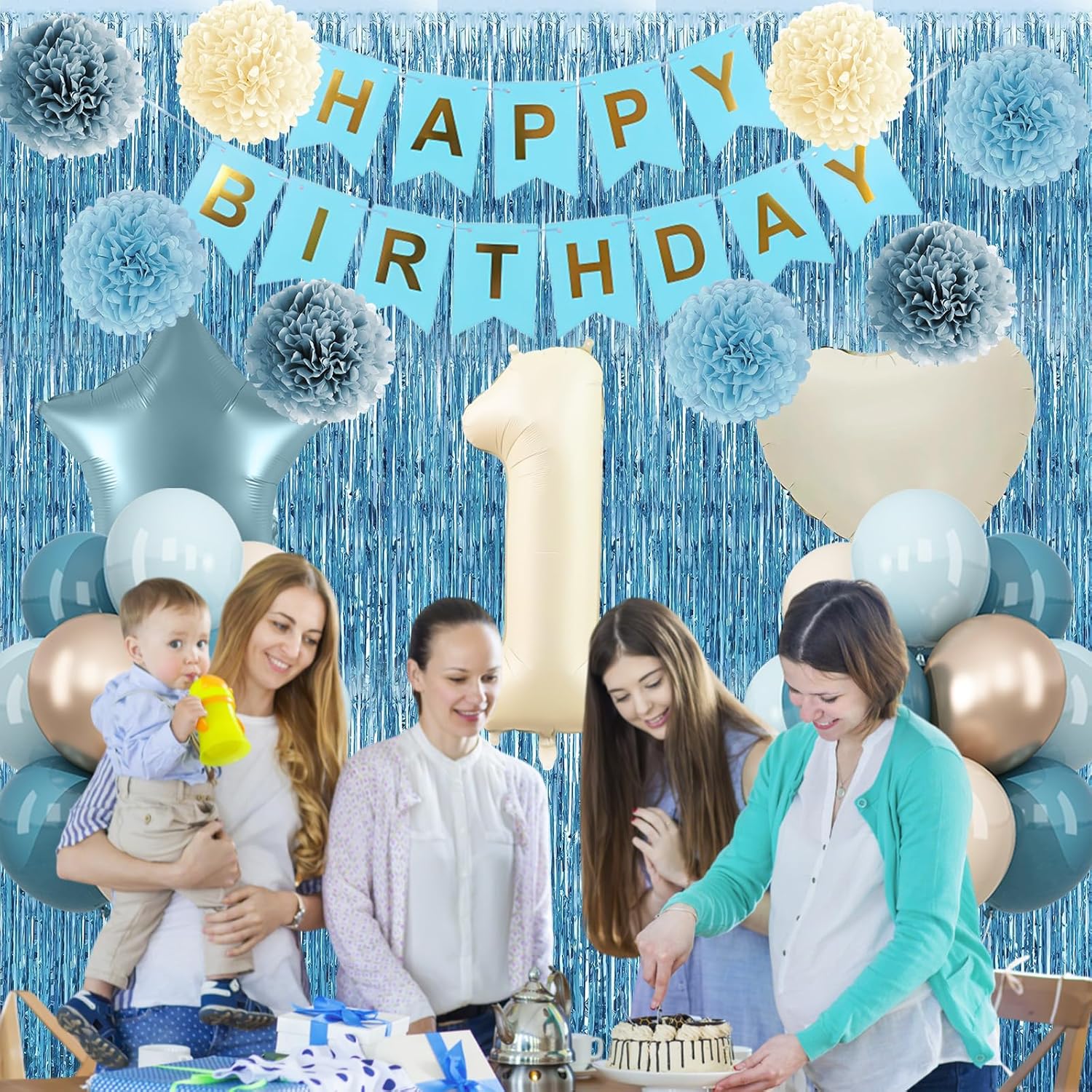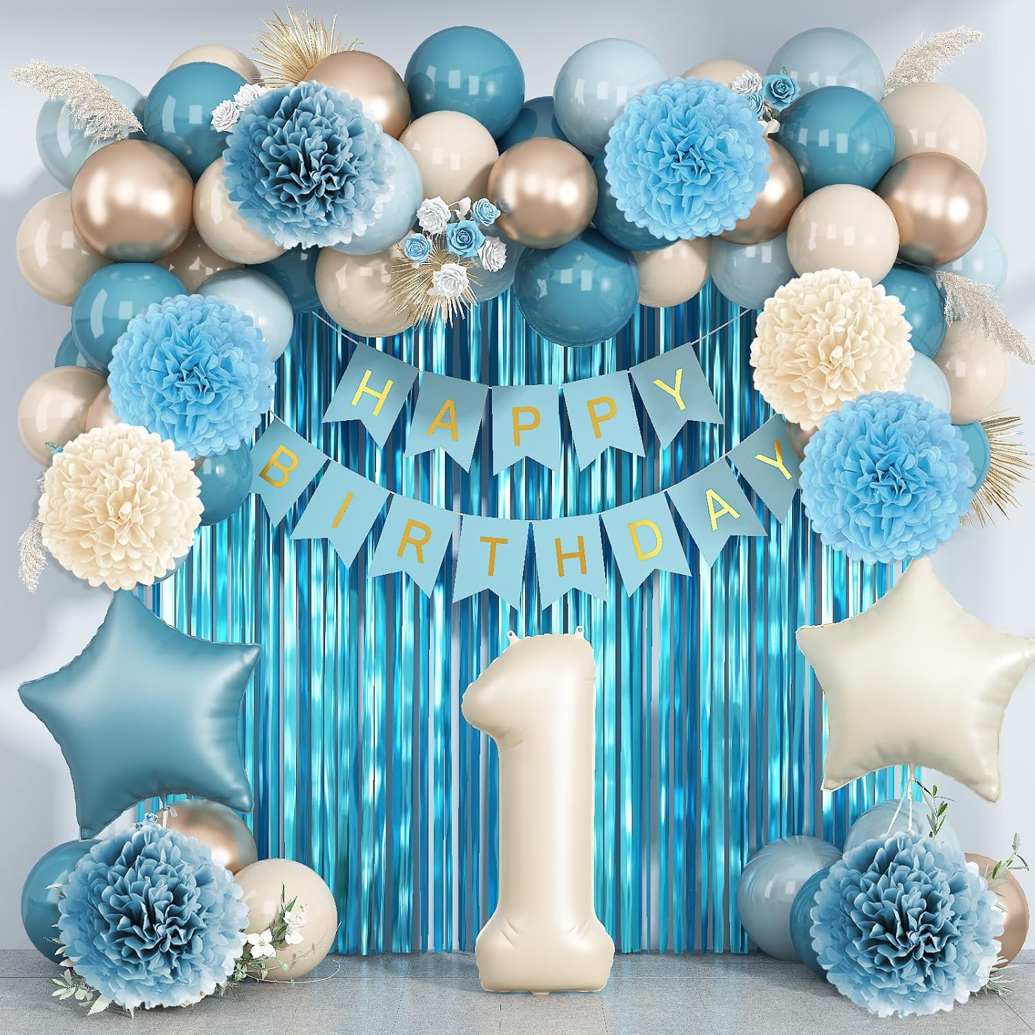 • ALL-IN-ONE DECORATION: Comes with a β€œ1” foil number balloon, includes everything you need: birthday banner, fringe curtain, blue beige gold balloons, star foil balloons, paper pom poms, and ribbon, ideal for first birthdays, baby showers, milestone moments, photo shoots, and family gatherings, suits both indoor and outdoor setups