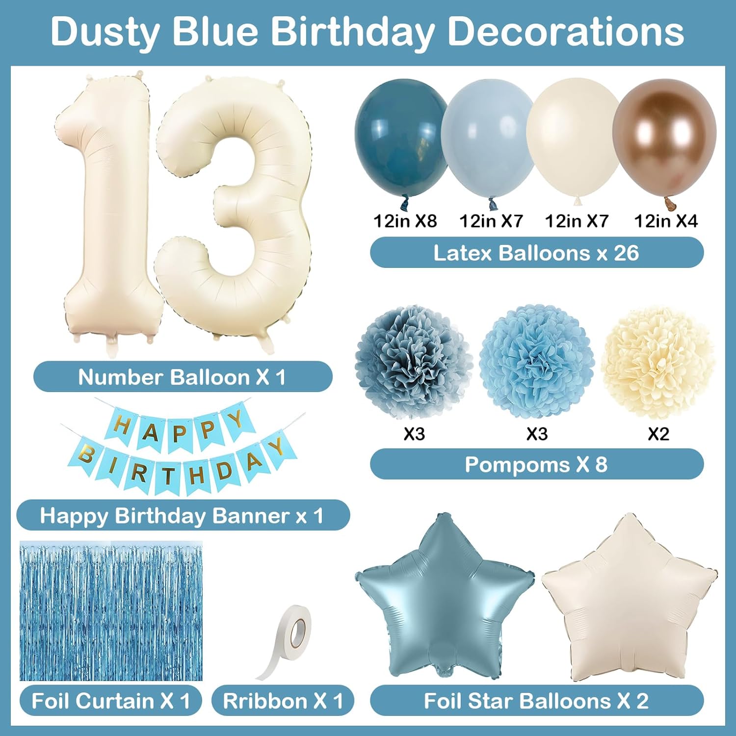 • PACKAGE INCLUDES: 1pc 13 number balloon, 1pc happy birthday banner, 3pcs light blue paper Pom Poms, 3pcs dusty blue paper pom poms, 3pcs nude paper pom poms, 1pc blue fringe curtain, 2pcs dusty blue star foil balloons, 8pcs dusty blue balloons, 7pcs fog blue balloons, 7pcs beige balloons, 4pcs champagne gold balloons, 1pc ribbon
