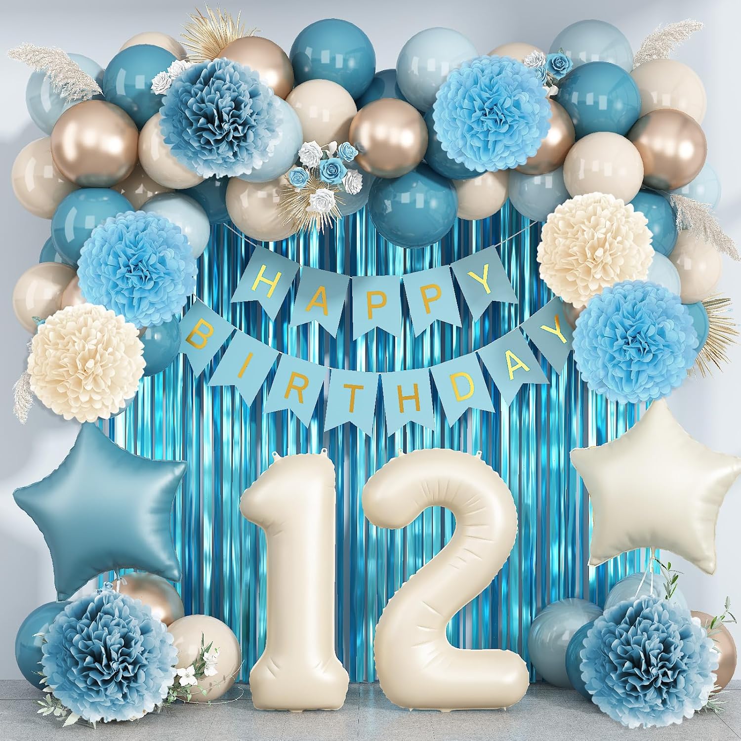 • ALL-IN-ONE DECORATION: Comes with a β€œ12” foil number balloon, includes everything you need: birthday banner, fringe curtain, blue beige gold balloons, star foil balloons, paper pom poms, and ribbon, ideal for 12 year old birthdays, 12th birthday party, photo shoots, and family gatherings, suits both indoor and outdoor setups